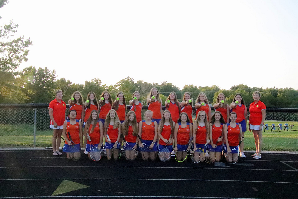 Front Row: Left to Right: Jean Lin, Kaitlyn Olmstead, Charlotte Schackmann, Grace Warfel, Jessilyn Hall, Jaleena Hemrich, Kayla Kocher, Stephanie Brinson, Olivia Zumbahlen, Paige Klingler. Second Row: Coach Sandy Webb, Abbie Fitzmaurice, Avery Zumbahlen, Chloe Kroenlein, Emily Probst, Darci Marble, Melanie Dion, Gracie Blake, Abby Menke, Jenny Sparks, Kendall Sessions, Rhianna Carter, Coach Janette Hickox.