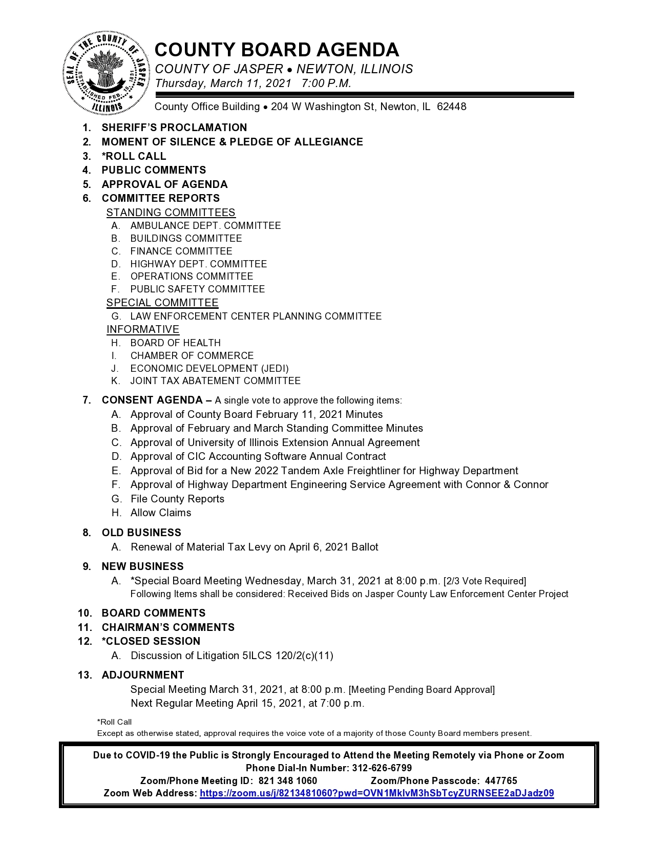 Jasper County Board Meeting Agenda for March