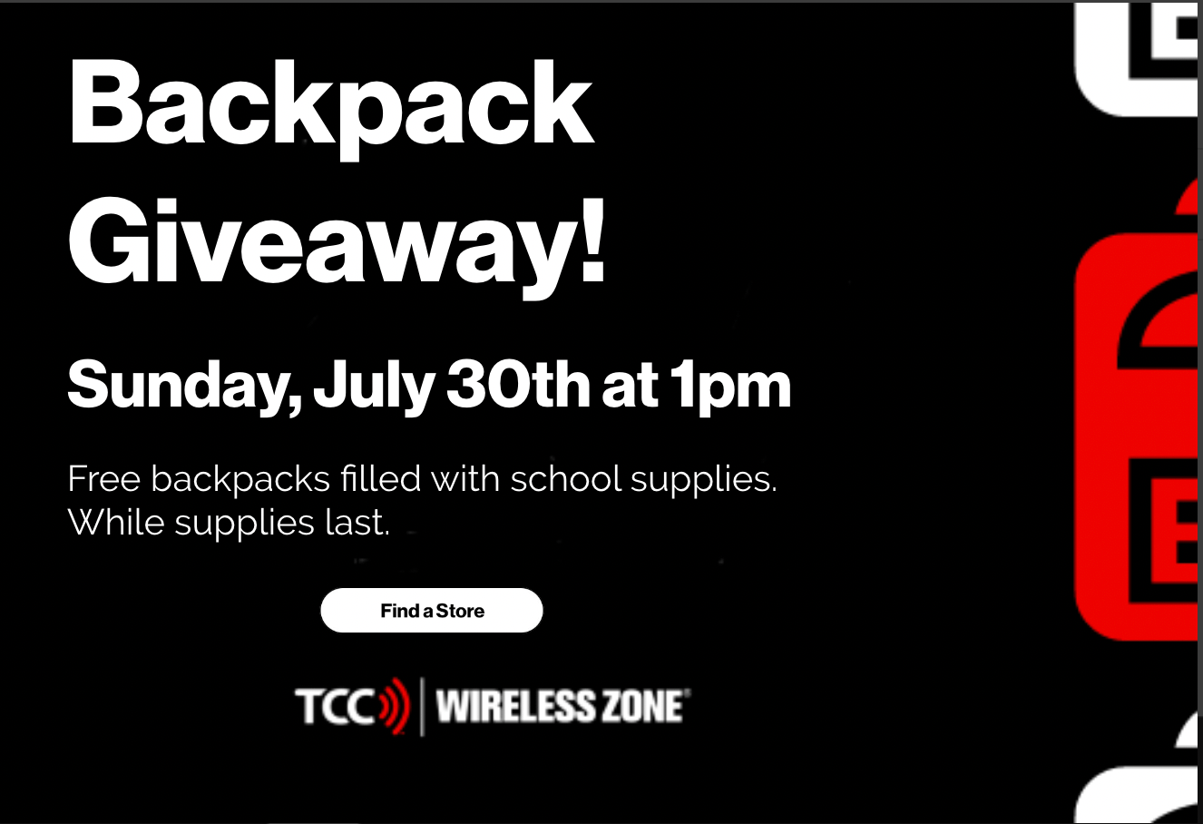 TCC and Wireless Zone to donate 120,000 backpacks with school supplies through the annual give back event on July 30 On Sunday, July 30 at 1 p.m. local time while supplies last, more than 1,000 TCC and Wireless Zone stores nationwide are inviting local families to their locations to pick up
