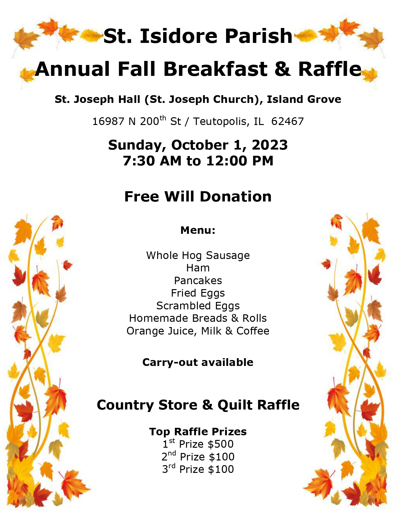 St. Isidore Parish, St. Joseph Hall / Church (Island Grove) located at 16987 N 200th St, Teutopolis, IL 62467 will be having its Annual Fall Breakfast and Raffle from 7:30 AM to 12:00 PM on Sunday, October 1, 2023, at the St. Joseph Hall (Church). Carry-out will be available. The menu