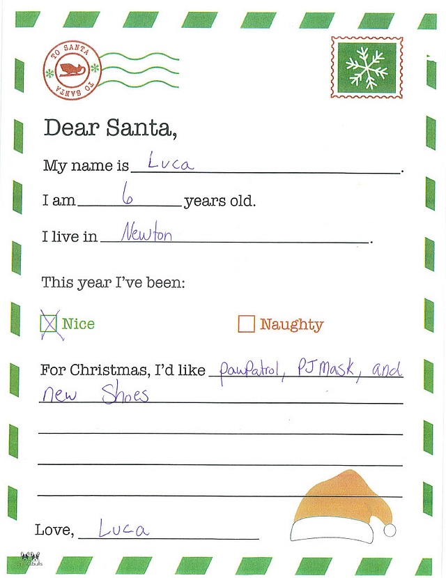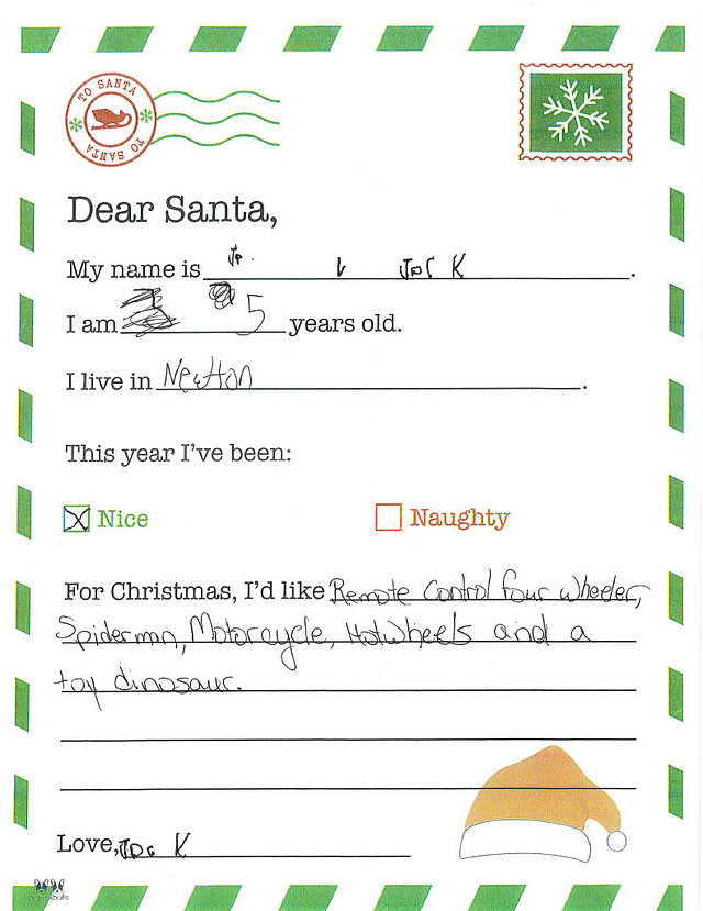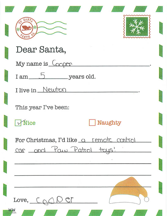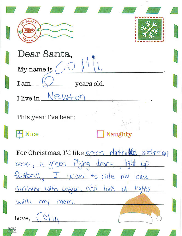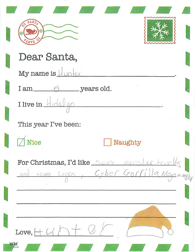 My name is Hunter. I am 5 years old, and I live in Newton. I have been really good this year. I would like it if you could bring me a superhero costume and a toy truck.