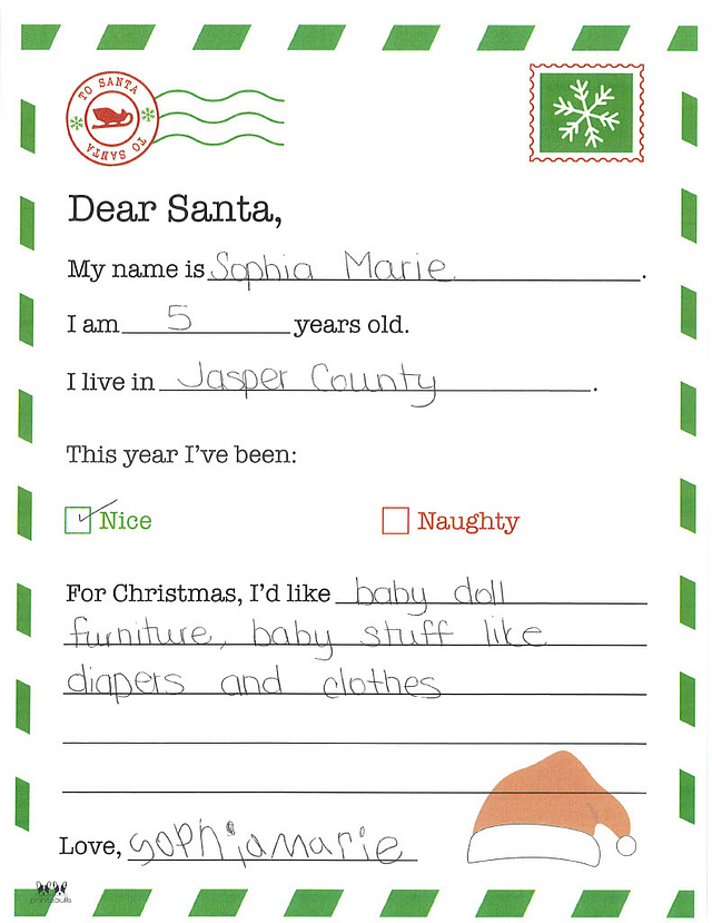 My name is Madi. I am 5 years old, and I live in Hidalgo. I have been really good this year. I would like it if you could bring me a dog and a gift card. Can I ride in your sleigh?
