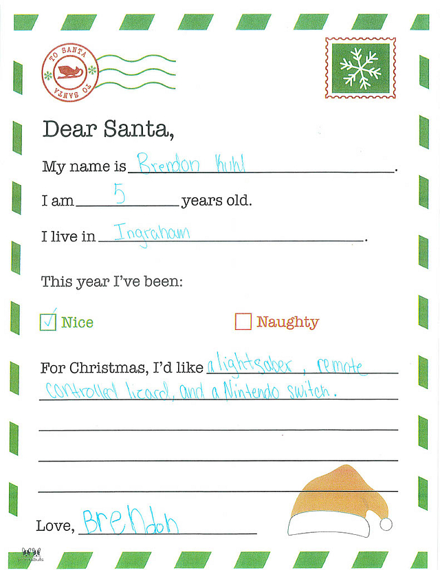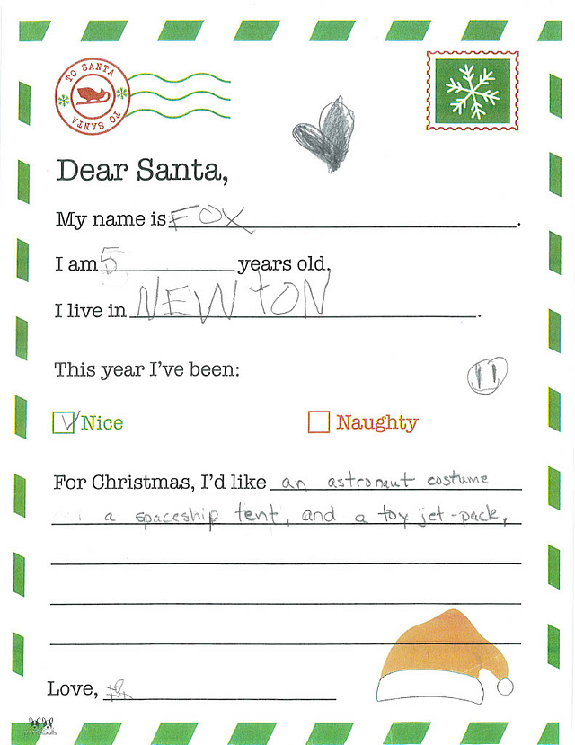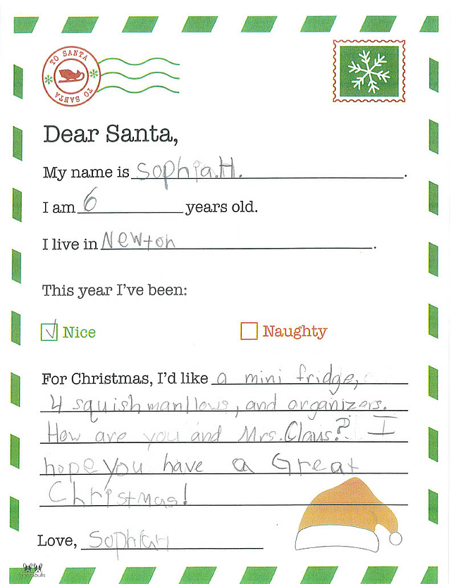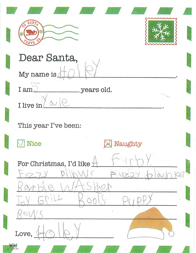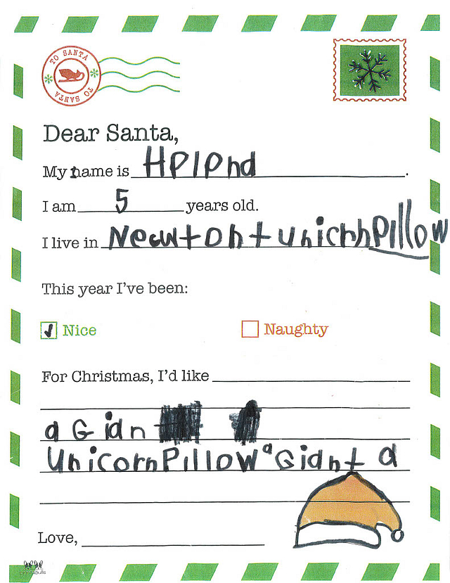 My name is Briar. I am 5 years old, and I live in Newton. I have been really good this year. I would like it if you could bring me smelly markers and Nerf bullets.