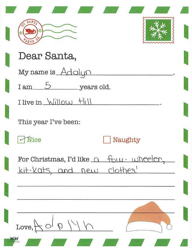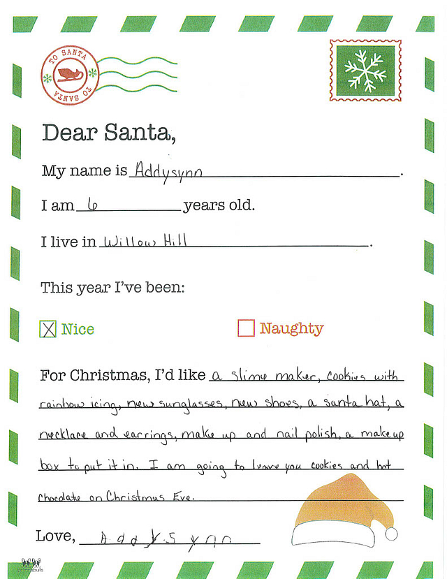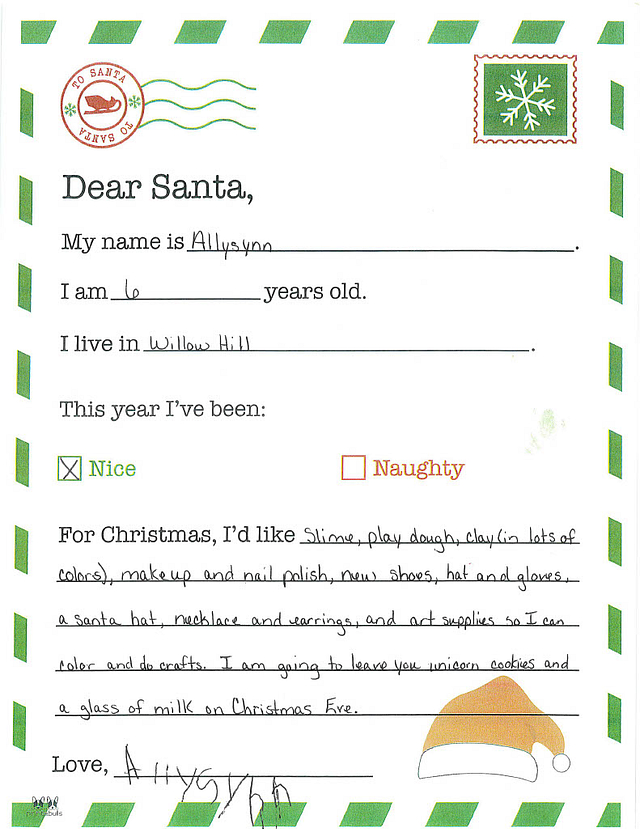 My name is Kinley. I am 6 years old, and I live in Willow Hill. I have been really good this year. I would like it if you could bring me a bean bag chair and makeup. How is your spirit going?