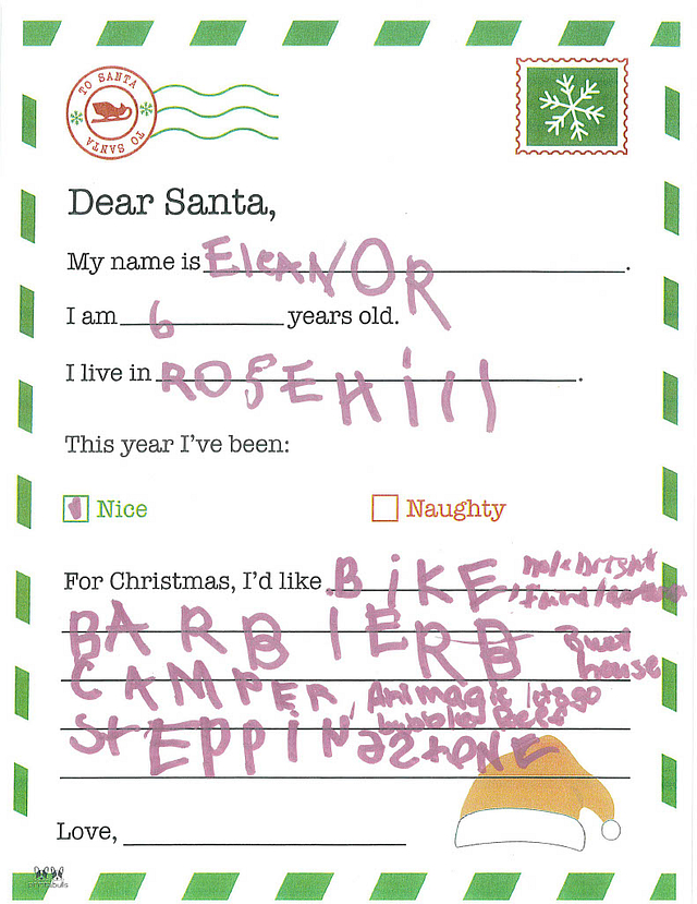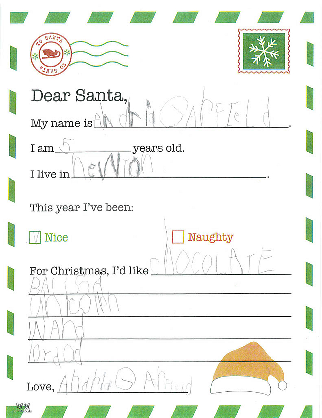 My name is Lily. I am 5 years old, and I live in Newton. I have been really good this year. I would like it if you could bring me a Barbie Dreamhouse and a marble runner. I hope you have a Merry Christmas, Santa.