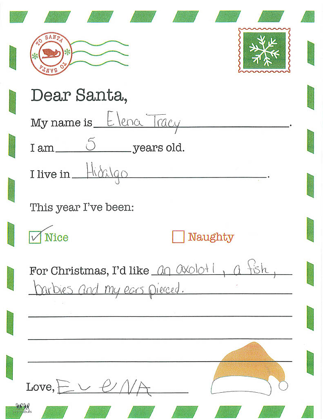 My behavior this year has been mostly good. My name is Avery, I’m 5 years old, and I live in Hidalgo. I would like a slime machine so I can have fun with my sister and Barbies. I could use some new shoes to run in. I have been nice to my friends and I help mommy. I hope you stay safe flying this Christmas!