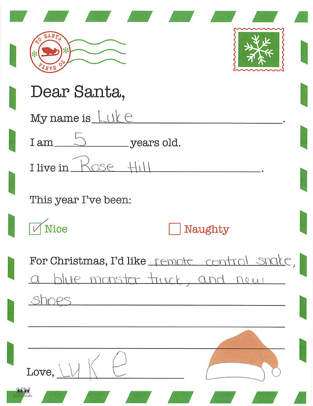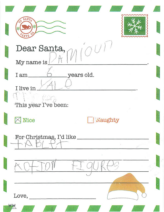 My name is Dwight and I am 6 years old. I live in Willow Hill. This year, I have been really nice. Could you bring me a robot with remote control?
