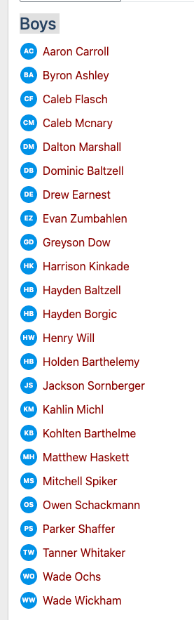 Third Row: Wade Ochs, Owen Schackmann, Drew Earnest, Quincy Fulton, Harrison Kinkade, Grayson Lingafelter, Owen Ulm, Max Heiser, Caleb Flasch, Hayden Borgic