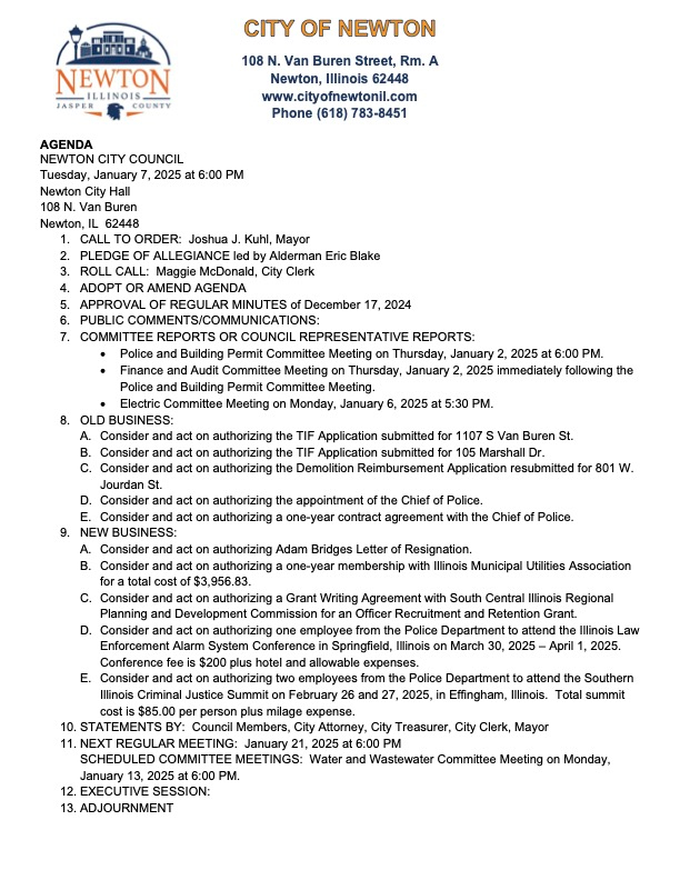 AGENDA NEWTON CITY COUNCIL Tuesday, January 7, 2025 at 6:00 PM Newton City Hall 108 N. Van Buren Newton, IL 62448 1. CALL TO ORDER: Joshua J. Kuhl, Mayor 2. PLEDGE OF ALLEGIANCE led by Alderman Eric Blake 3. ROLL CALL: Maggie McDonald, City Clerk 4. ADOPT OR AMEND AGENDA