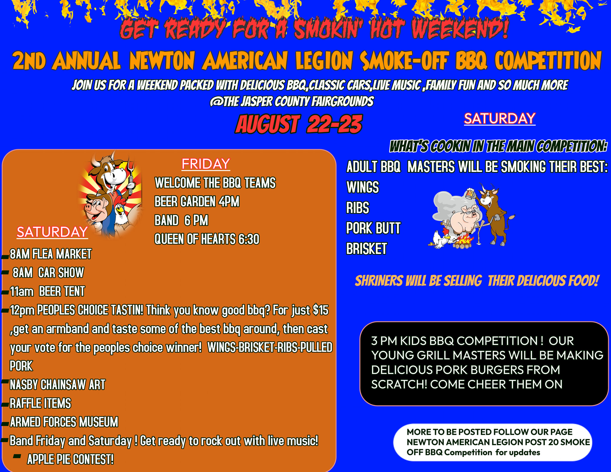 Newton, IL – Get ready for a weekend of delicious BBQ, classic cars, and family fun as the Newton American Legion Post 20 hosts its 2nd Annual Smoke-Off BBQ Competition on August 22nd and 23rd at the Jasper County Fairgrounds. This event promises to be a “smokin’ hot weekend” with