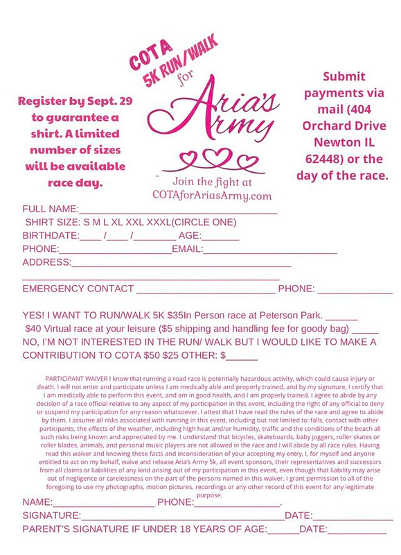 COTA for Aria’s Army is having a 5K fundraiser on October 7 at Peterson Park in Newton IL. This race can be done in person or virtual whenever and wherever you want. Registration fee is $35 in person and $40 virtually. If you need a form, email ariasarmy@outlook.com.