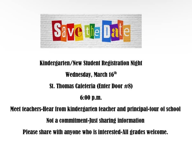 Tomorrow night! St. Thomas Kindergarten and new student registration night. Enter door 8 into the St. Thomas cafeteria at 6 pm. This is an informational meeting with a chance to meet the teachers, tour the school, and learn more about education at St. Thomas.