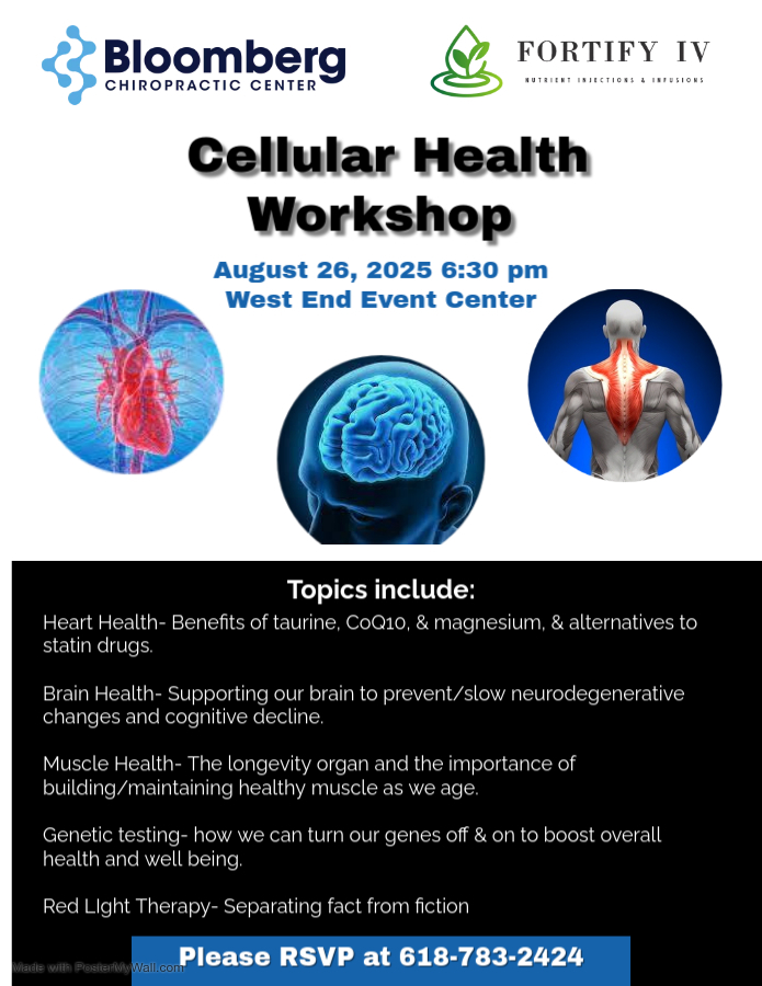 Join us on Tuesday, August 26 for our Cellular Health Workshop. This event is free to the public and will be held at West End Events Center beginning at 6:30PM. RSVP at 618-783-2424.