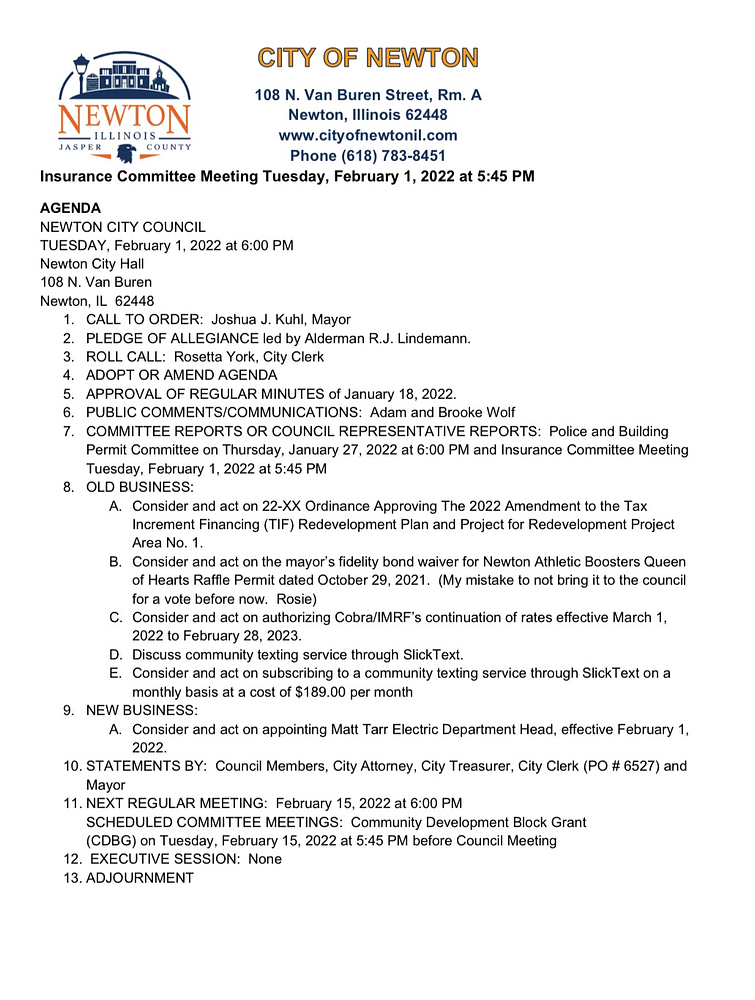 108 N. Van Buren Street, Rm. A Newton, Illinois 62448 www.cityofnewtonil.com Phone (618) 783-8451