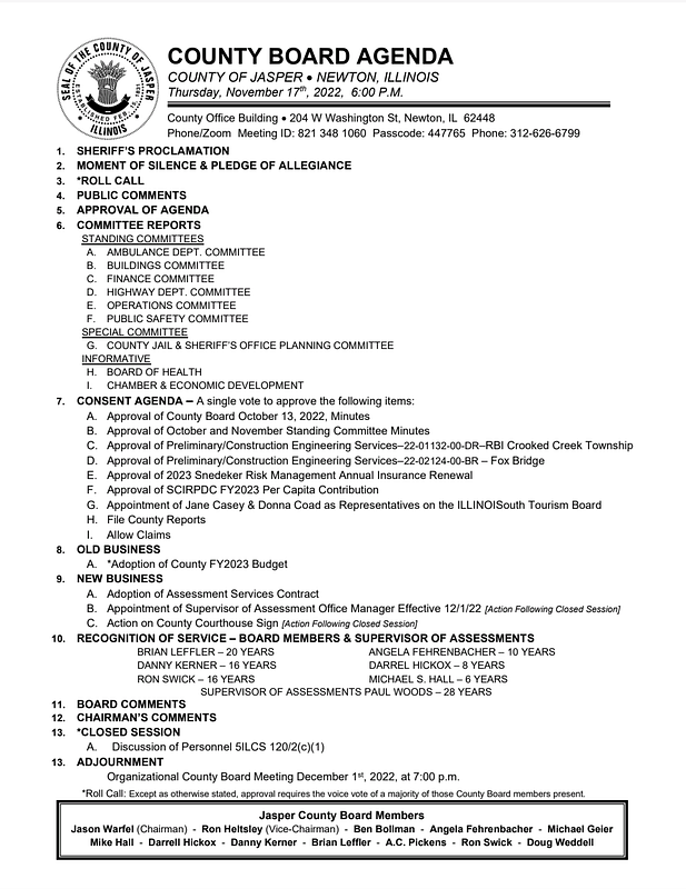 COUNTY OF JASPER  NEWTON, ILLINOIS Thursday, November 17th, 2022, 6:00 P.M.