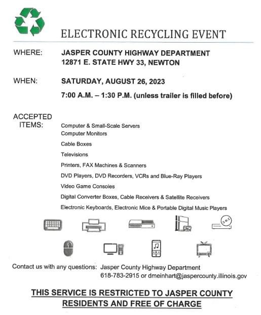 An electronic recycling event will be held on Saturday August 26th from 7 am to 1:30 unless the trailer is filled before. For fill information see flyer.