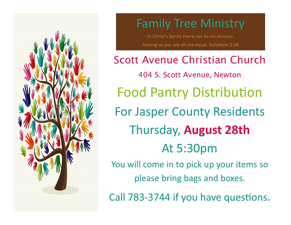 Newton, IL – Family Tree Ministry, in partnership with Scott Avenue Christian Church, will be holding a Food Pantry Distribution event for Jasper County residents on Thursday, August 28th at 5:30 p.m. The event will take place at Scott Avenue Christian Church, located at 404 S. Scott Avenue in Newton.