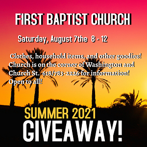 The First Baptist Church of Newton is having their annual Summer Give-Away on Saturday, August 7, 8 til 12. Clothes, household items, and other goodies! Church is on the corner of Washington and Church St. 618/783-2226 for information! Open to all!
