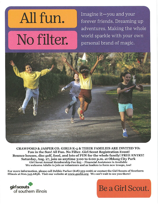 Bounce houses, disc golf, food, and lots of FUN for the whole family! FREE ENTRY! Saturday, Aug. 27, join us anytime 3:00 to 6:00 p.m. at Oblong City Park Girl Scout Annual Membership Fee $25 – Financial Assistance is Available