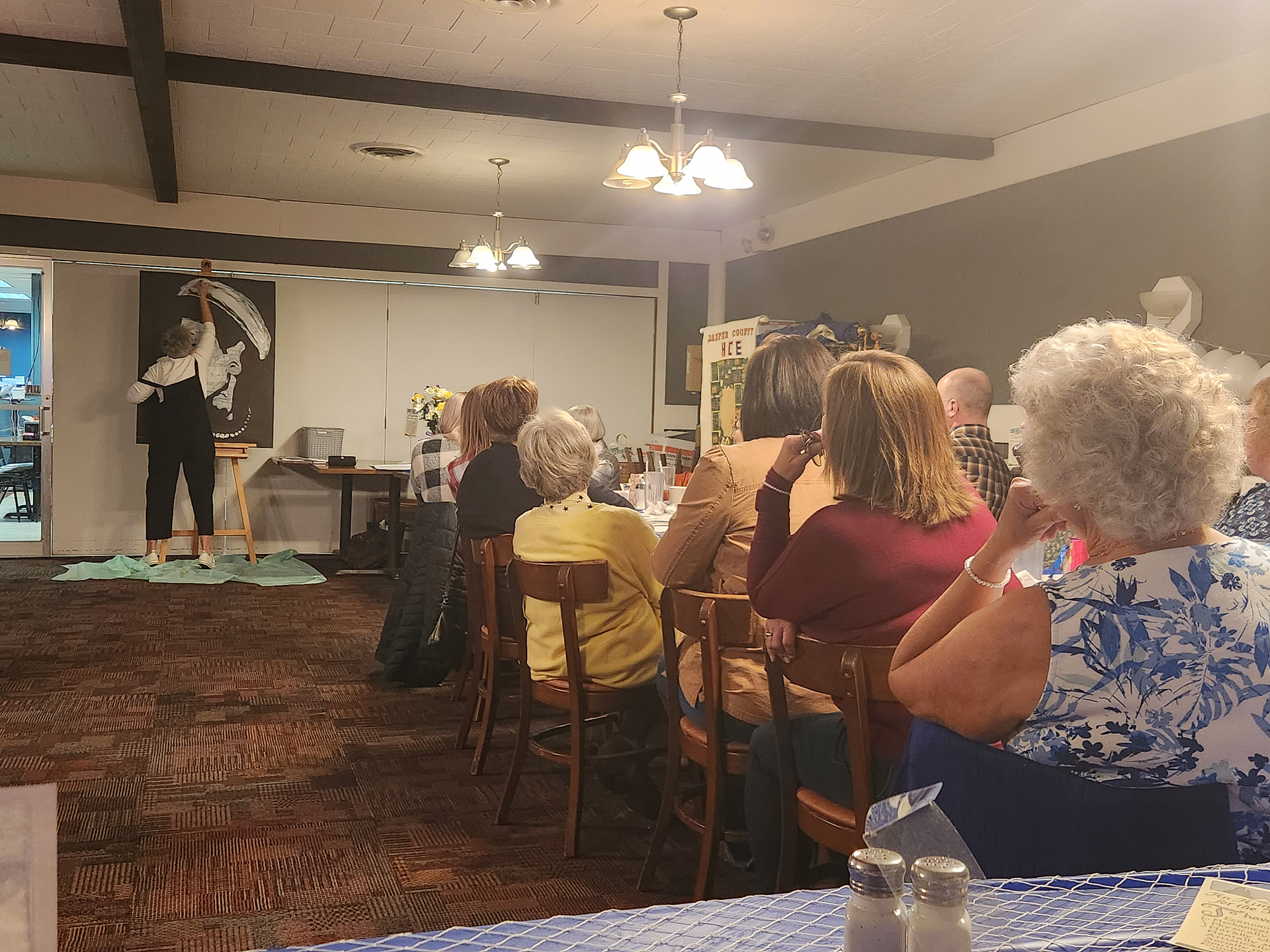 Everyone attending the Jasper County HCE Annual Banquet and Meeting on Monday, April 24, was in for a treat watching Becky Belcher, of McLeansboro, Illinois, create a chalk drawing set to music! Melanie Dion, daughter of Lori and Tim Dion, and granddaughter of JoAnn and Melvin Birk, won the $500 Scholarship Award! HCE Board Members were installed: President, Judy Millsap; First and Second Vice President, Marlene Harris; Secretary/Treasurer, Donna Richards; 4-H, Family, and Community Issues, Martha Allison; Cultural and International Issues, Kathy Yager. Thanks to Parklanes for a delicious meal.