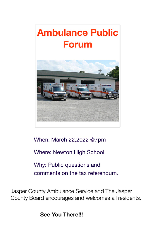 There will be a public forum about the tax referendum for the Jasper County Ambulance service on March 22 at 7:00pm at Newton Community High School.