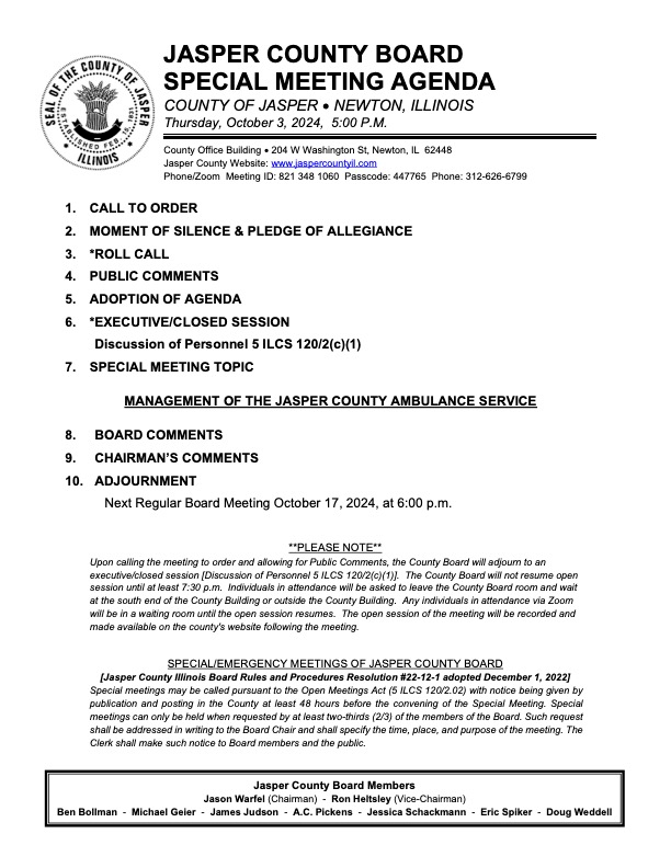 SPECIAL/EMERGENCY MEETINGS OF JASPER COUNTY BOARD