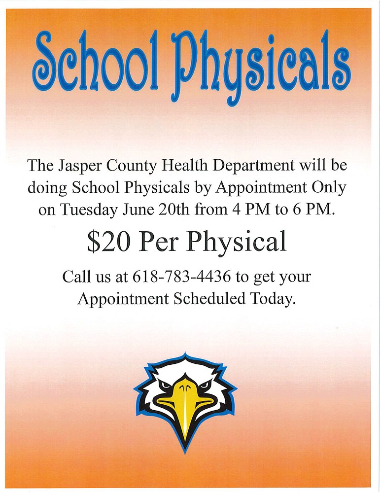 The Jasper County Health Department will be doing school physicals by appointment only on Tuesday, June 20 from 4 pm to 6 pm. The cost will be $20 per physical call 618-783-4436 to schedule an appointment.