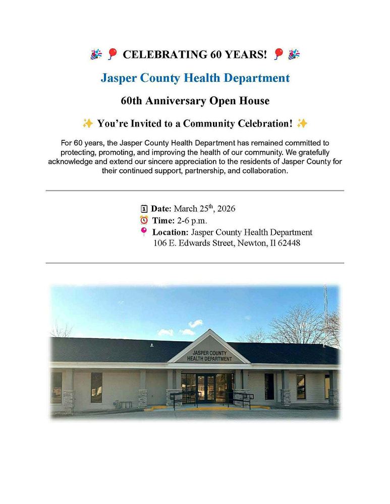 Residents are invited to attend the 60th Anniversary Open House on Tuesday, March 25, 2026, from 2:00 p.m. to 6:00 p.m. at the Jasper County Health Department, located at 106 E. Edwards Street in Newton.