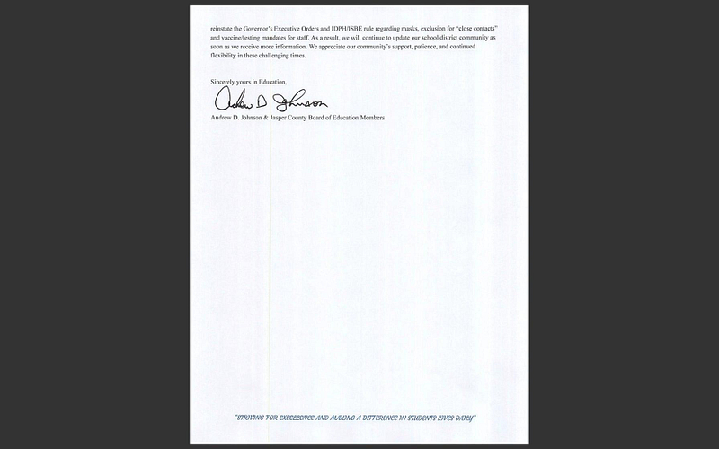 As many of you are aware, late on Friday, February 4, 2022 Sangamon County Circuit Judge Raylene Grischow entered a temporary restraining order (TRO) prohibiting the defendant school districts from (i) requiring students and teachers to wear masks, absent a lawful order of quarantine issued in conformance with the IDPH Act; (ii) excluding students and teachers based on an alleged close contact unless due process is afforded and IDPH procedures are followed; and (iii) requiring weekly COVID-19 testing for unvaccinated employees without first providing due process of law. Also, in case you are not aware, the Jasper County Community Unit School District No. 1 was named a defendant in both lawsuits pertaining to students and staff.  As a result, the judge’s order bars the District from enforcing these COVID-19 mitigation measures.