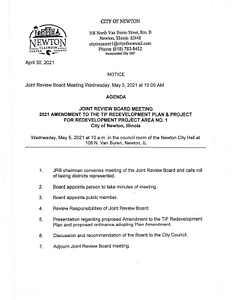 There will be a Joint Review Board Meeting on Wednesday, May 5, 2021 at 10:00 am. This will be in regards to the 2021 Amendment to the TIF Redevelopment Plan and Project for Redevelopment Project Area Number 1.