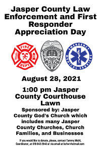 On August 28, the Jasper County God’s Church group will be hosting a Law Enforcement and First Responders Appreciation day at 1:00 pm on the Jasper County Courthouse lawn. The Jasper County God’s Church group consists of some of the local churches, church families, and businesses.