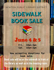 The Newton Public Library District will be hosting a Sidewalk Book Sale on Friday, June 4th from 10 am to 5pm and Saturday from 10am to 2pm.