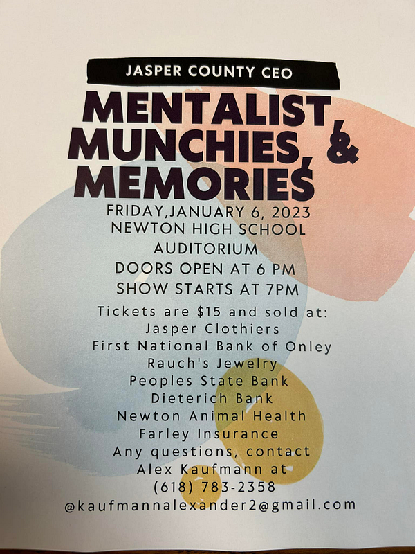 On January 6, the Jasper County CEO class business event will be held in the NCHS Auditorium. Mentalist Munchies, and Memories features Jym Elders who for over two decades has been a mentalist and according to his bio “His award-winning mentalism has been amazing corporate and college audiences from New York to Los Angeles to Calgary and everywhere in between. Having a lifelong fascination with the paranormal and all things mysterious, Jym Elders utilizes his background in psychology, theater, and magic to create a show that is both mesmerizing and memorable.”