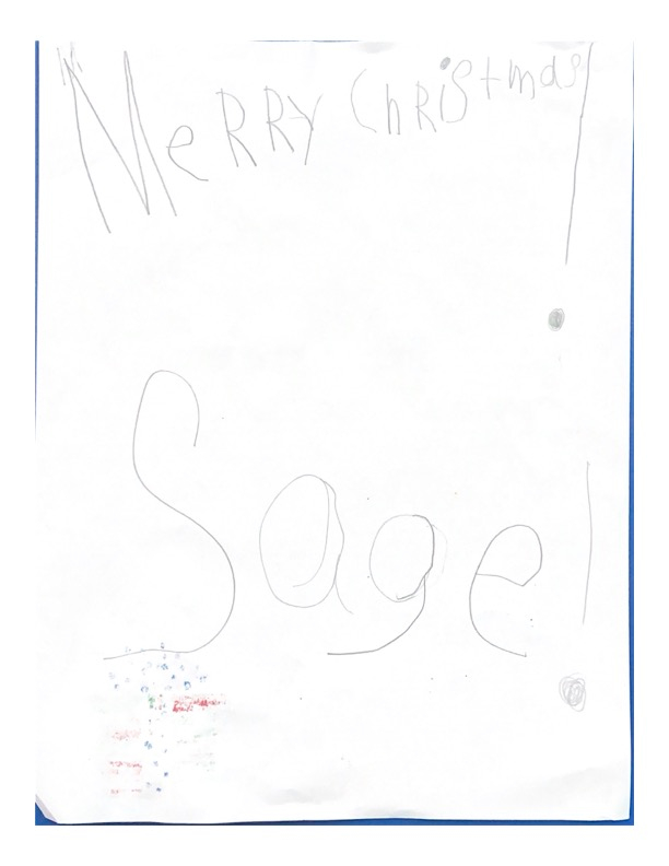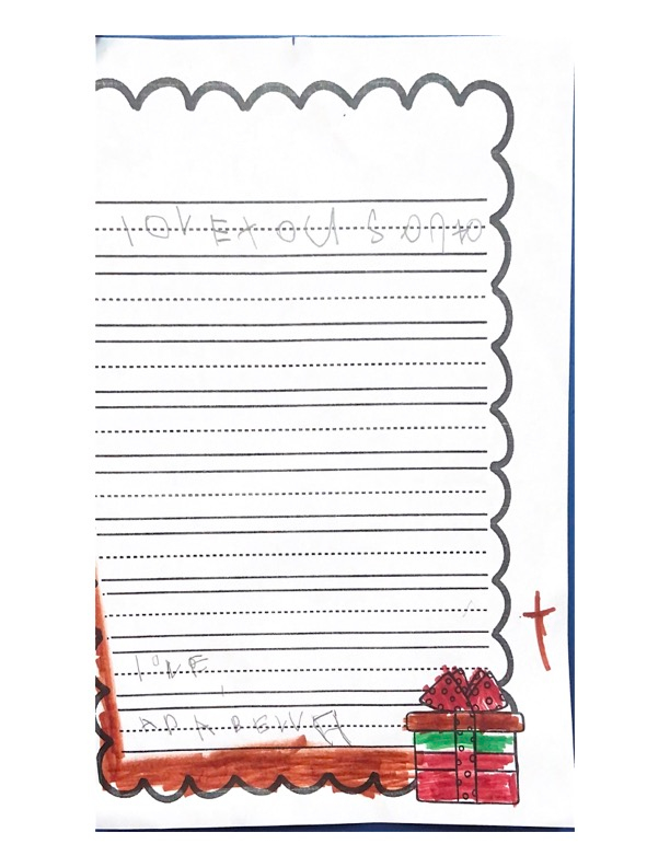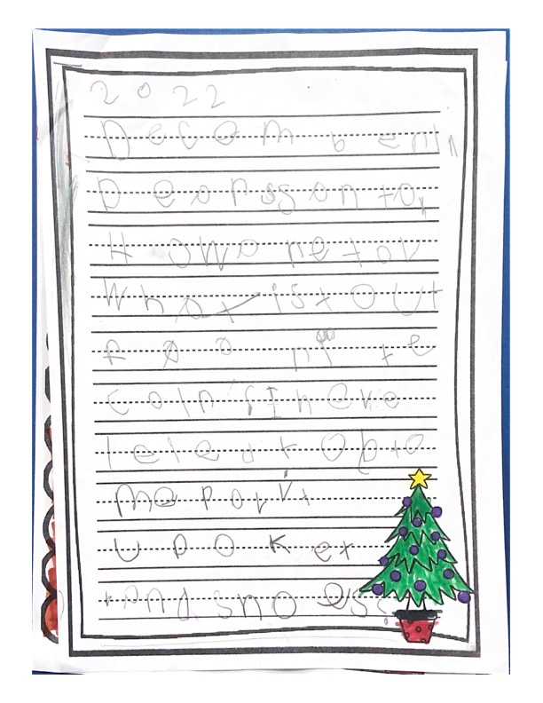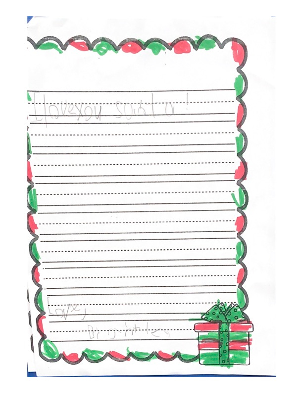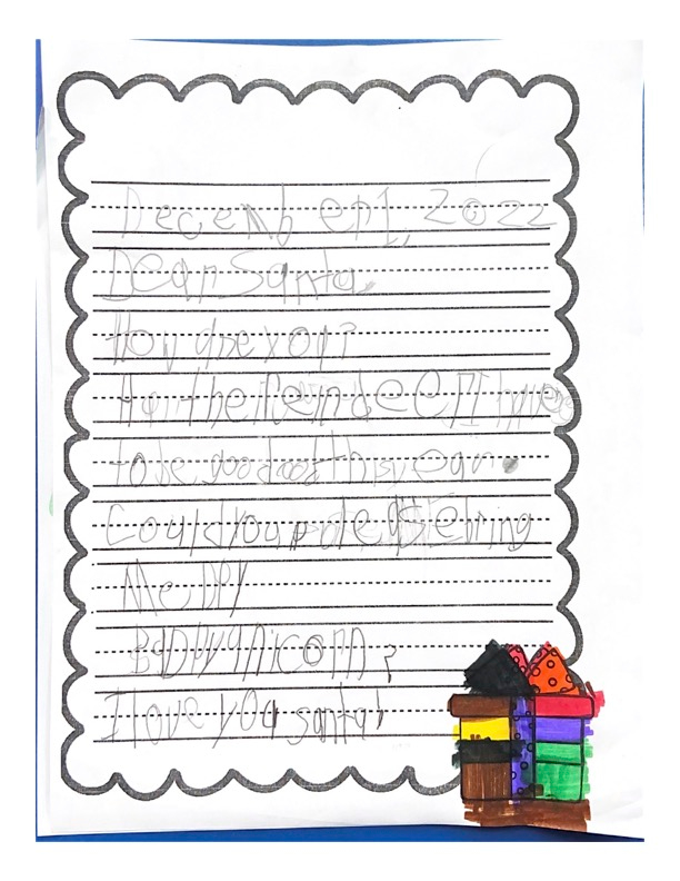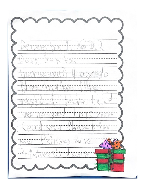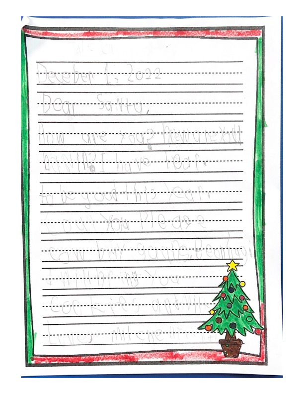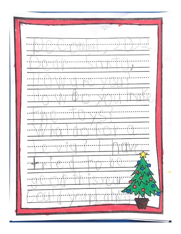 Hello my name is Journey. This year I am living with my cousins. I hope you find their house. I hope I’m on the nice list, because I have been extra good this year. This year I want stuffed animals, like cats and dogs. Please bring Sophie an Elsa doll. Please bring a toy for Jacobi. Don’t forget my aunt and uncle too. Santa I can not wait for you to come! Santa I will leave three cookies and water for you. Do you want milk? I have some questions for you. Do you like water? Do you want me to leave food for your reindeer? Do you have Rudolph on your team? I hope you have a Merry Christmas Santa!