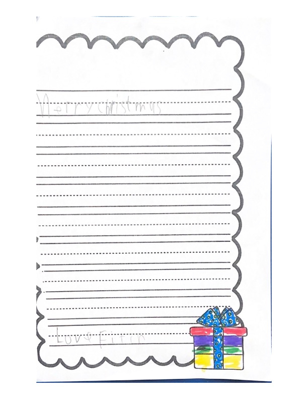 Thank you for working hard to make my presents. How are you, Santa? This year for Christmas I would like a shark squishy and a watch that tracks my steps. I will leave out cookies and milk for you. Merry Christmas, Santa!