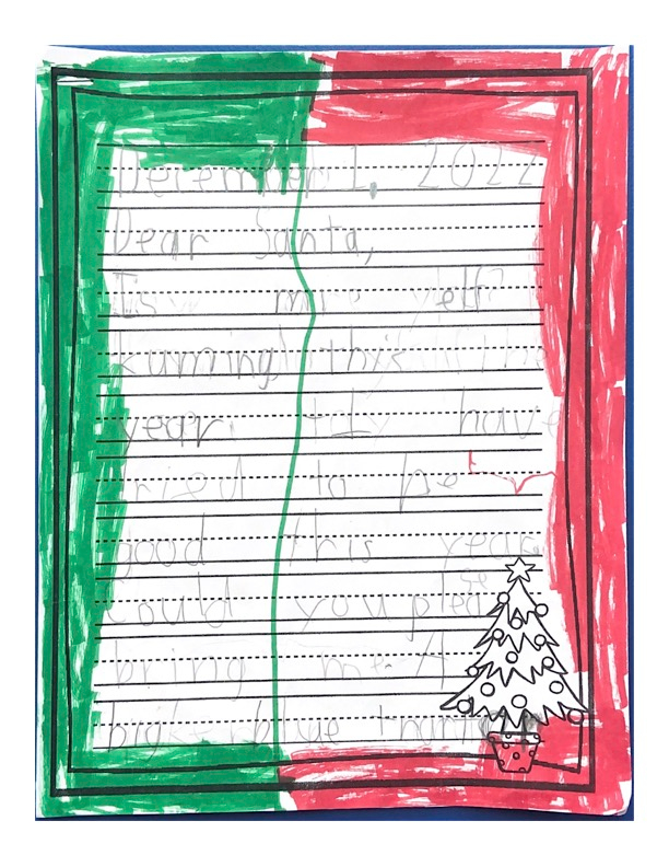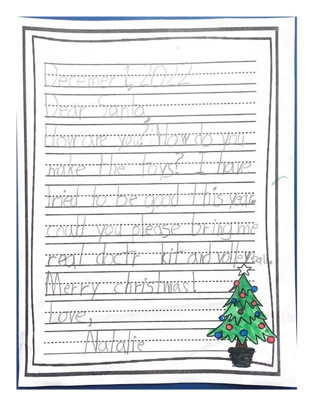 Thank you for working hard to make my toys. How do the reindeer fly? This year for Christmas I would like books and art supplies please. I will leave out carrots for the reindeer. Merry Christmas, Santa!