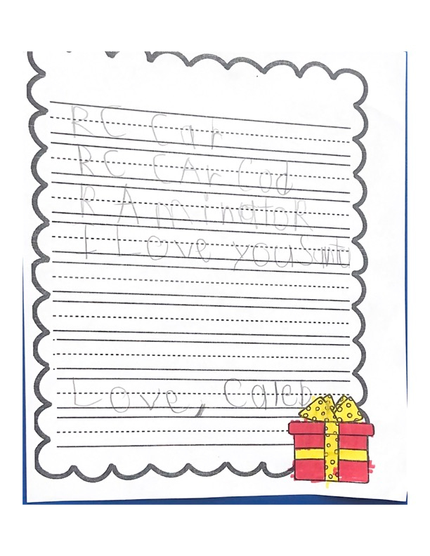 Hello my name is Spencer. This year I am turning seven. I hope I am on the good list, because I clean my brother’s room for him. Thank you Satna for the RC last year. This year I would like an RC Car. I also need a new flashlight. Please bring my dog a chew toy. Santa I can not wait for you to come! Santa I will leave some cookies for you. Santa I have have some questions for you. How is Rudolph. I hope he is good. Also how do you fly your sleigh. I think the reindeer help it fly.