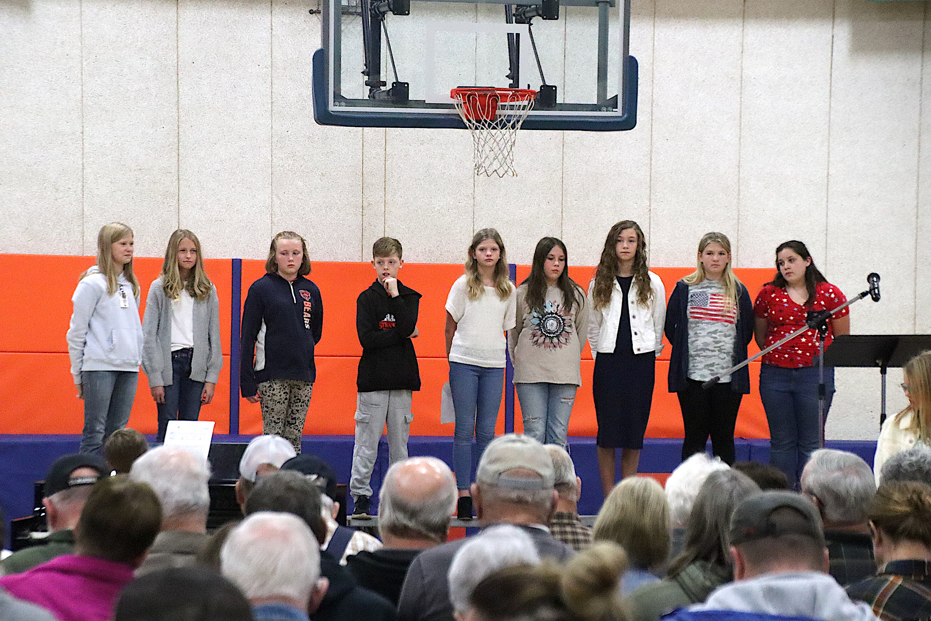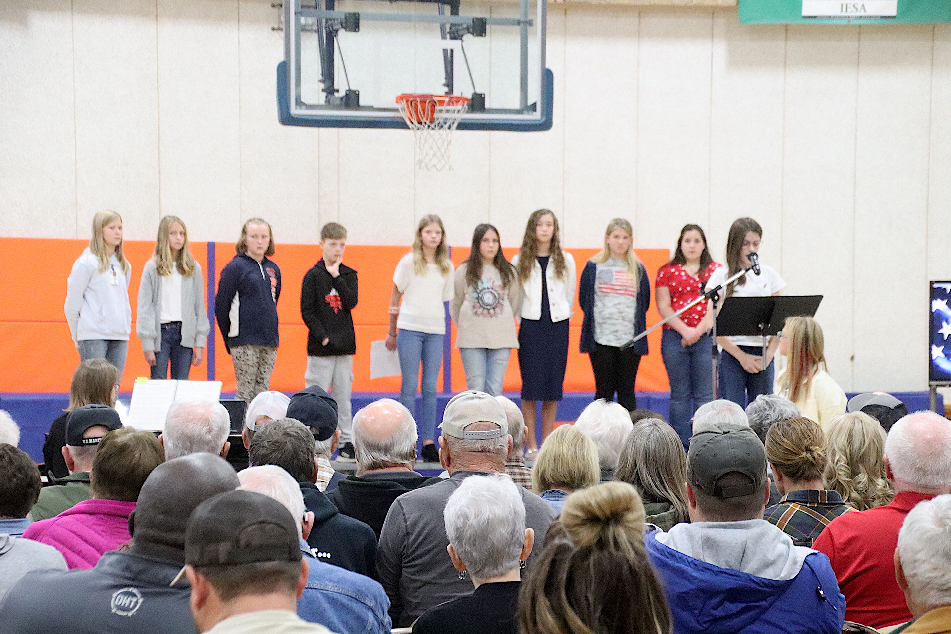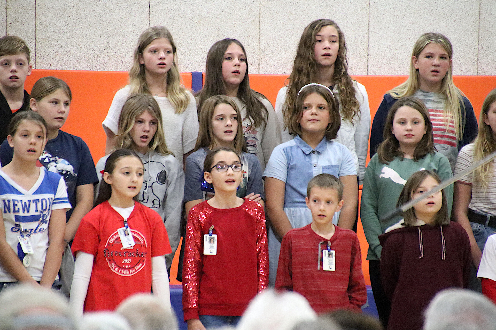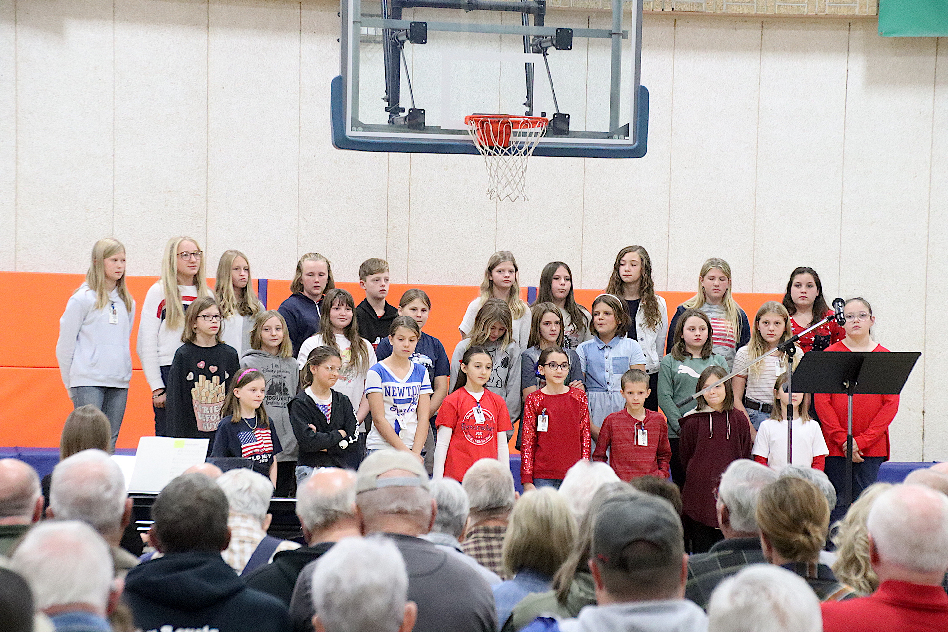 The Newton Elementary Chorus members performed the Star Spangled Banner. Aria Collins, 5th grade gave a warm welcome to all in attendance. Shen Guzman and Lilly Cobble from 5th grade orally presented thank you letters to the veterans. “God Bless America” was performed by the NES chorus. Additional thank you letters were read by Nicole Kuhl and Chance Tracy both sixth graders. The third grade class sang “You’re a Grand Old Flag” with Natalie Briscoe, 6th grade, read the meaning of Veteran’s Day. The fourth grade class sang “The Flag Goes By”. Cora Warfel, 6th grader, honored and recognized the veterans. Taps was played by NCHS Junior Ella Radke and Braidyn Sparkling, 6th grader, closed the ceremony.