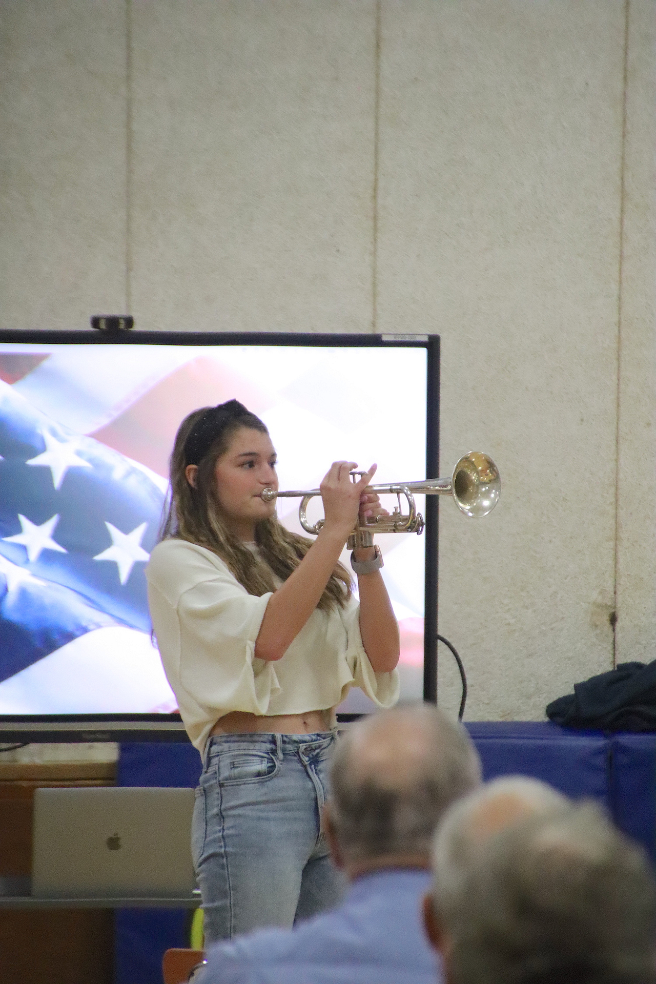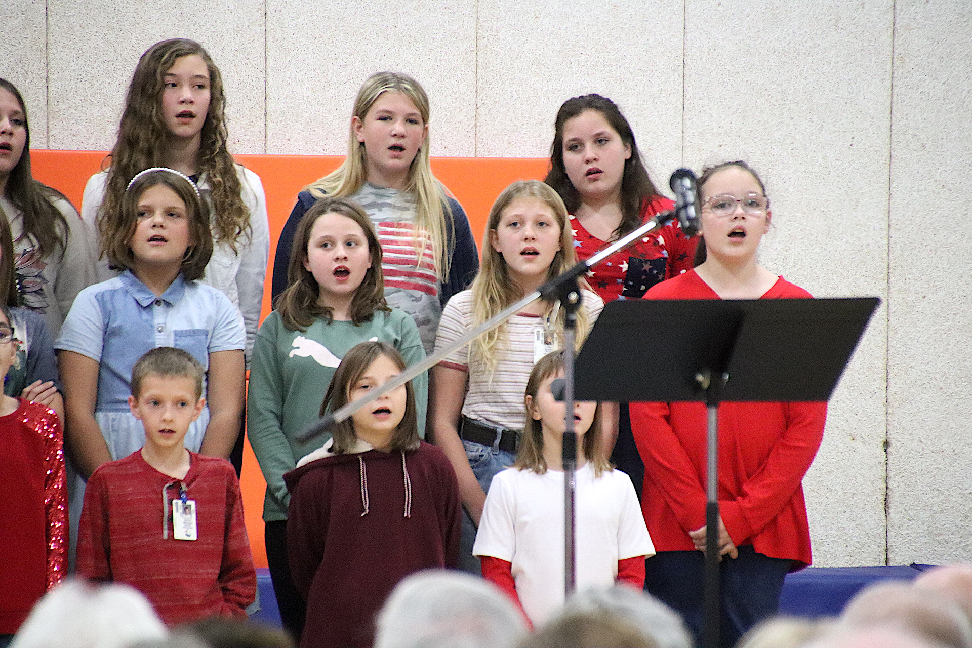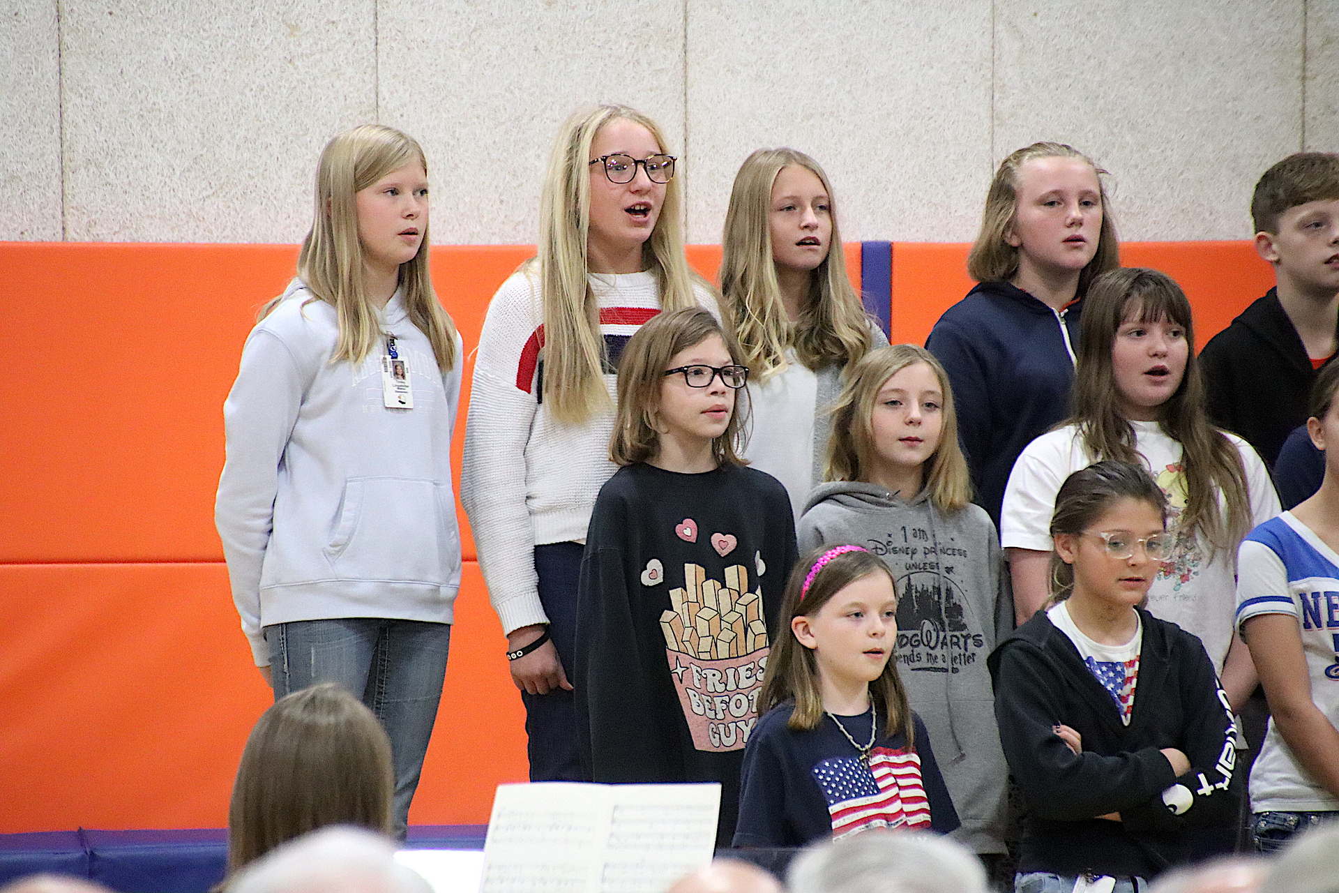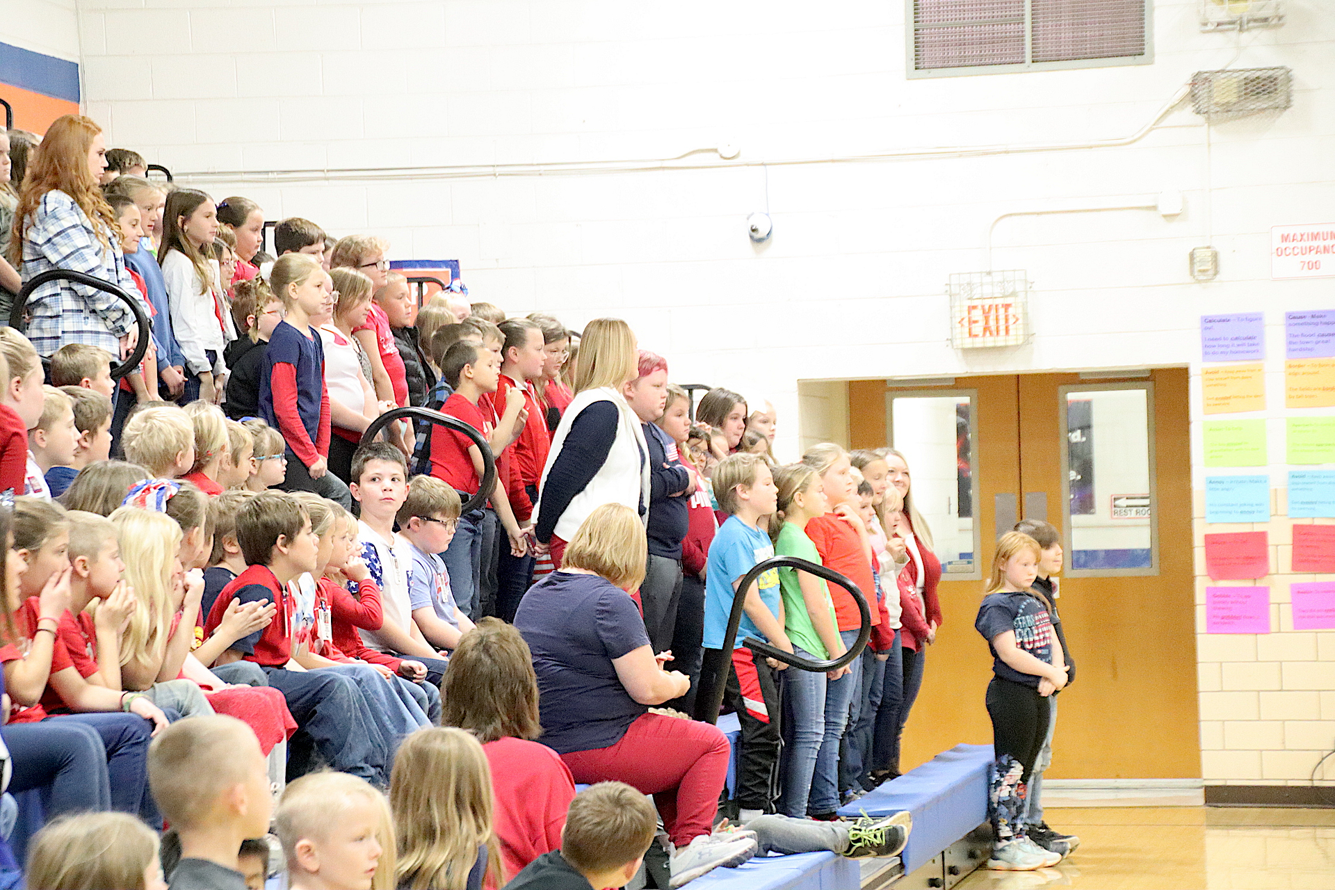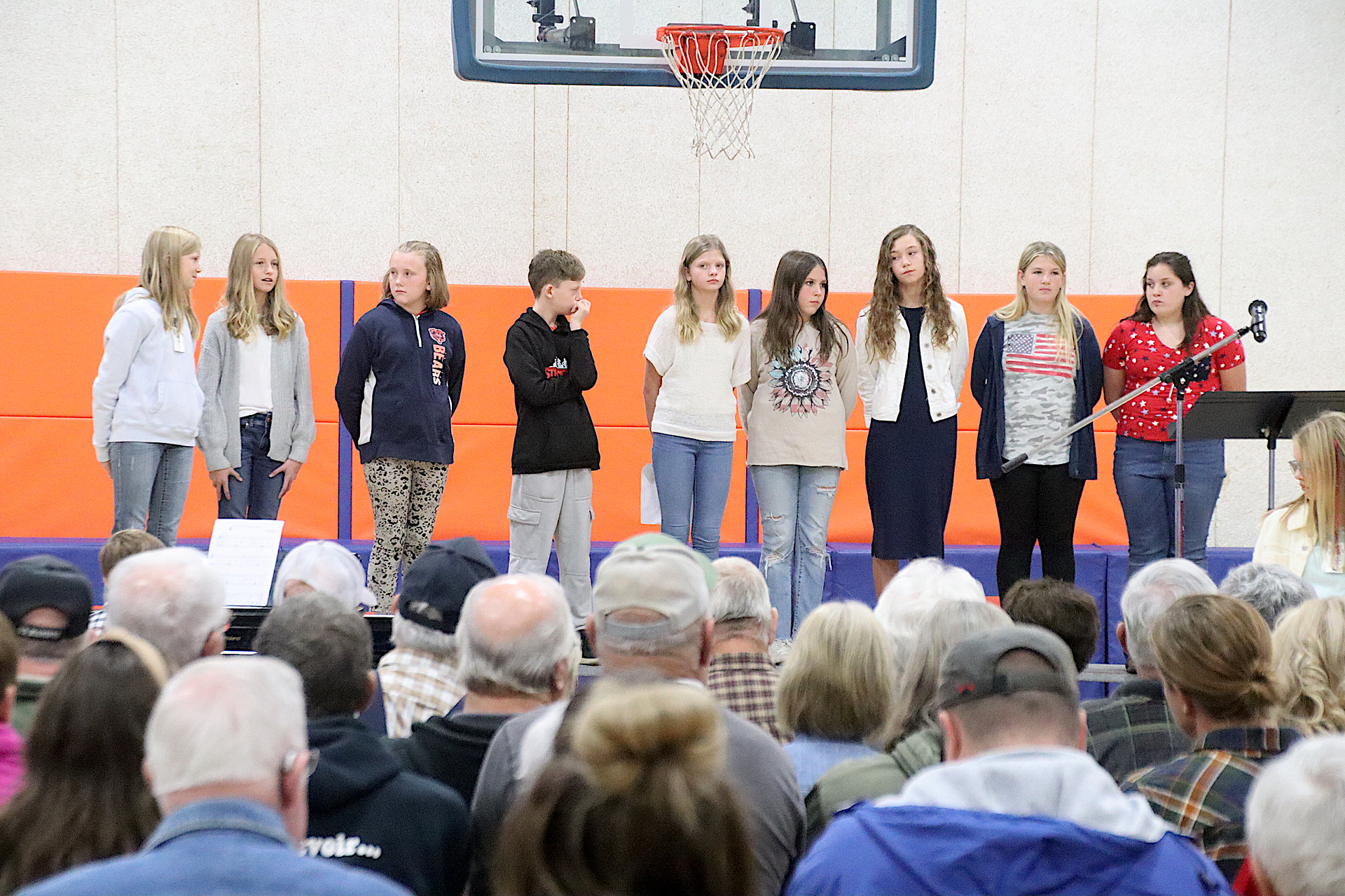 The Newton Elementary Chorus members performed the Star Spangled Banner. Aria Collins, 5th grade gave a warm welcome to all in attendance. Shen Guzman and Lilly Cobble from 5th grade orally presented thank you letters to the veterans. “God Bless America” was performed by the NES chorus. Additional thank you letters were read by Nicole Kuhl and Chance Tracy both sixth graders. The third grade class sang “You’re a Grand Old Flag” with Natalie Briscoe, 6th grade, read the meaning of Veteran’s Day. The fourth grade class sang “The Flag Goes By”. Cora Warfel, 6th grader, honored and recognized the veterans. Taps was played by NCHS Junior Ella Radke and Braidyn Sparkling, 6th grader, closed the ceremony.