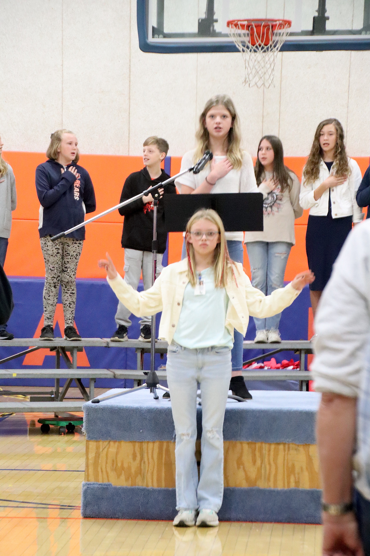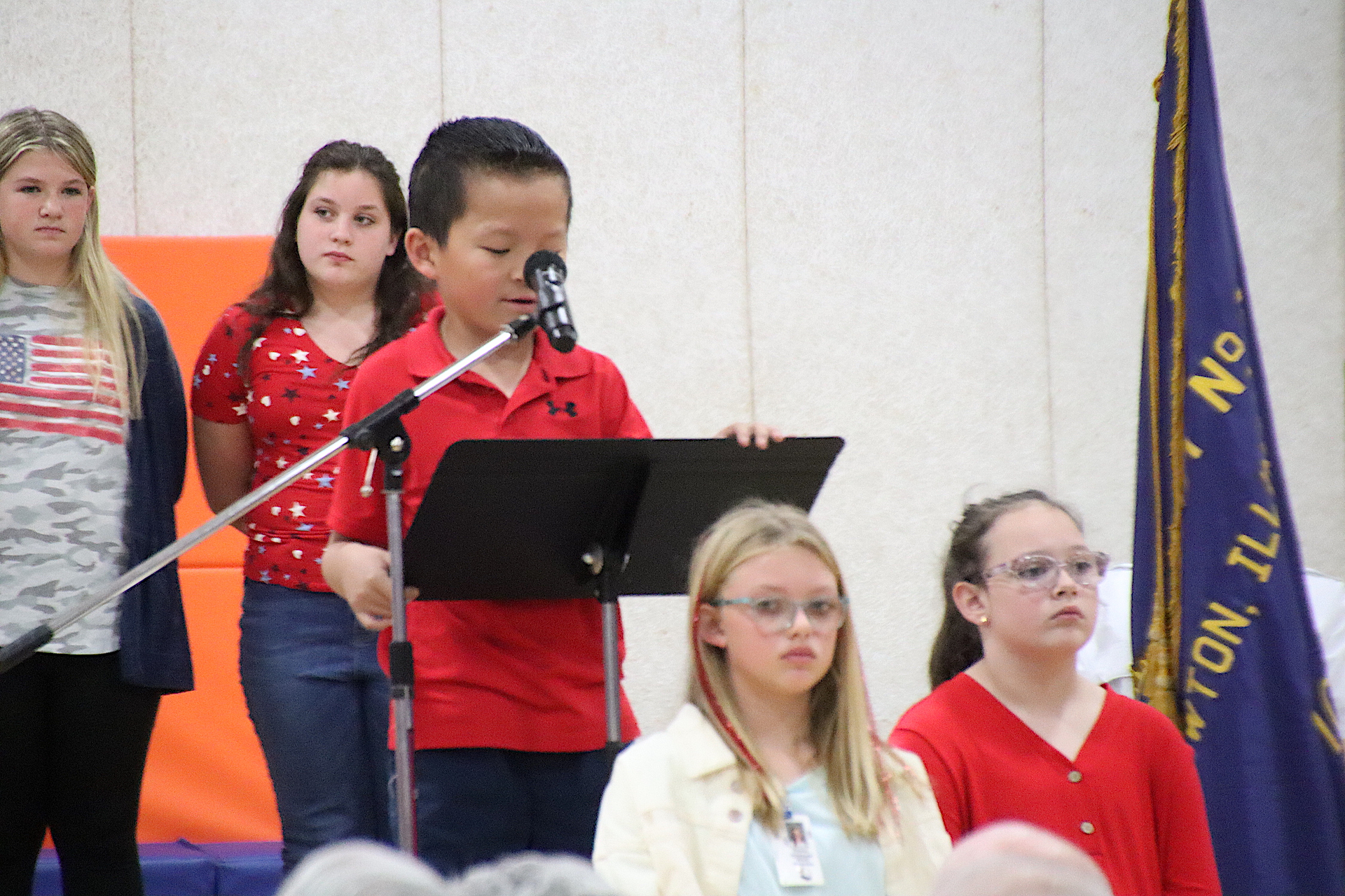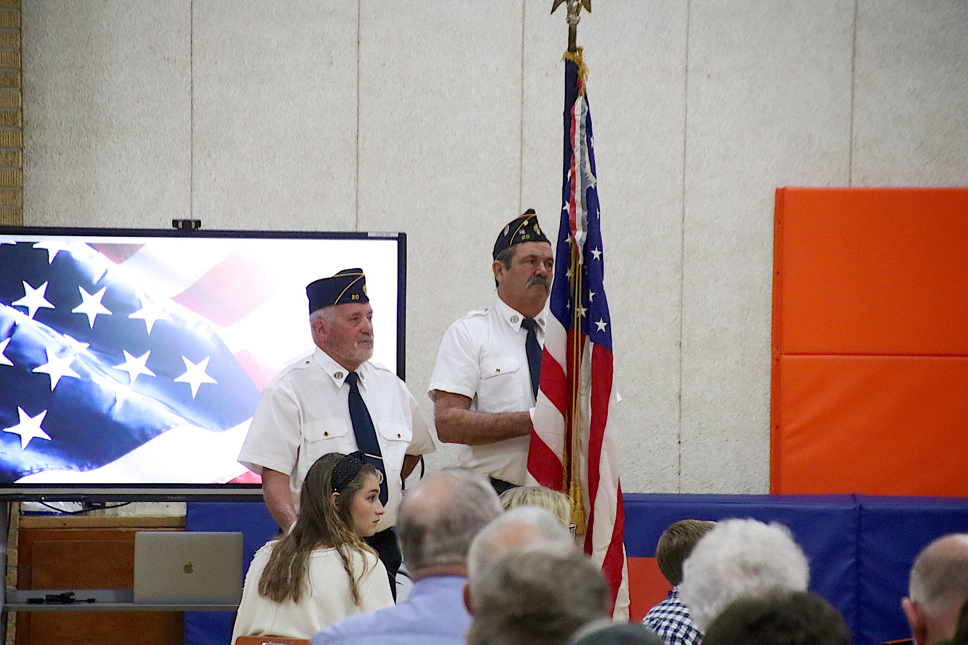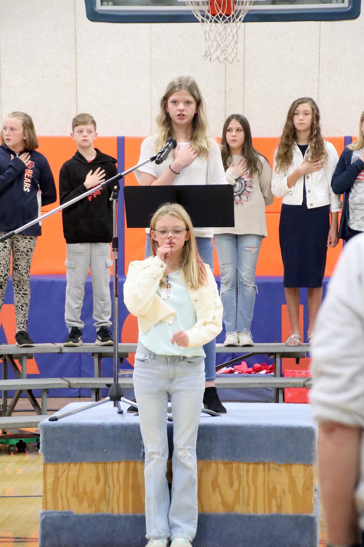 The Presentation of the Colors was completed by the American Legion Members. The Pledge of Allegiance was led by Piper Ghast, 6th grade and signed by Emma Glidewell, 5th grade.