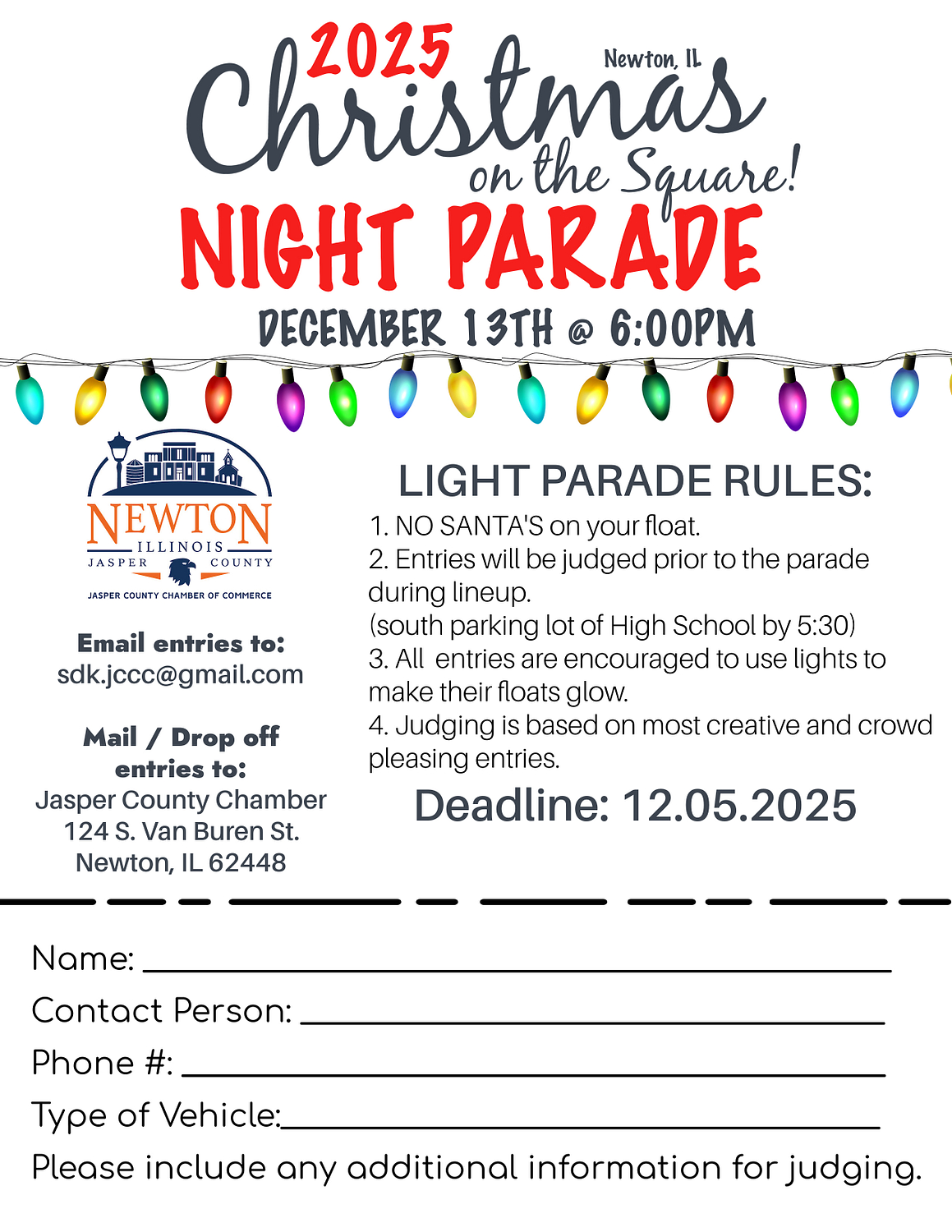 Float entries may be emailed to sdk.jccc@gmail.com or dropped off at the Jasper County Chamber, 124 S. Van Buren St., Newton, IL 62448. The entry deadline is December 5, 2025.