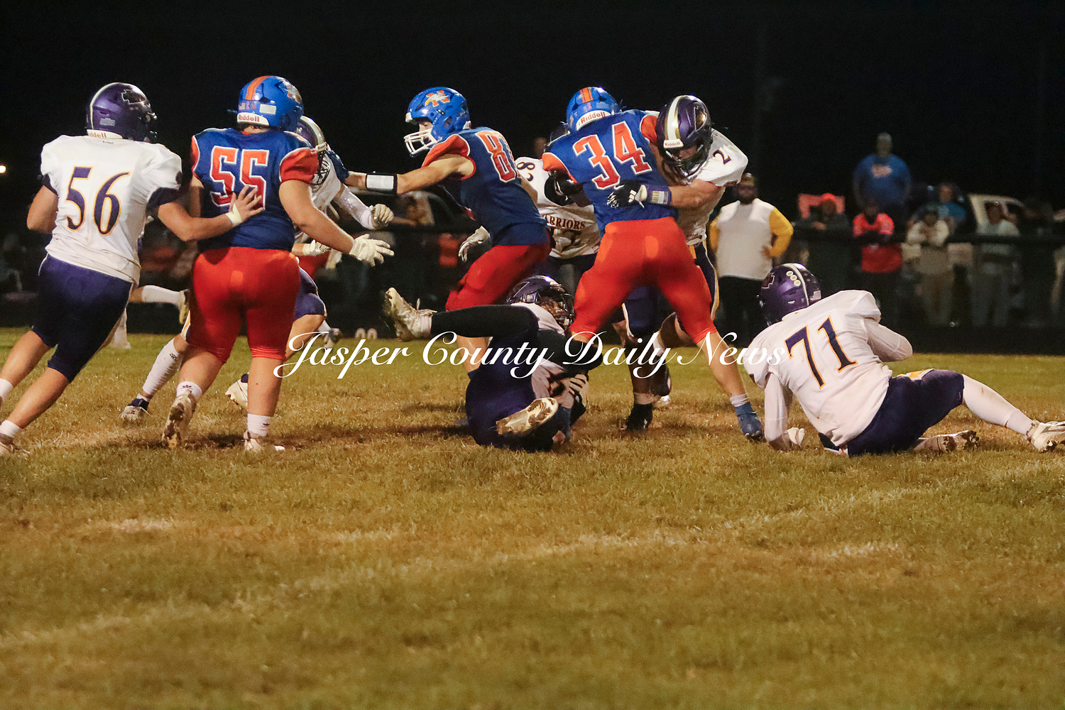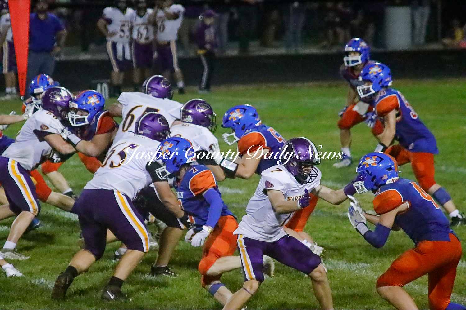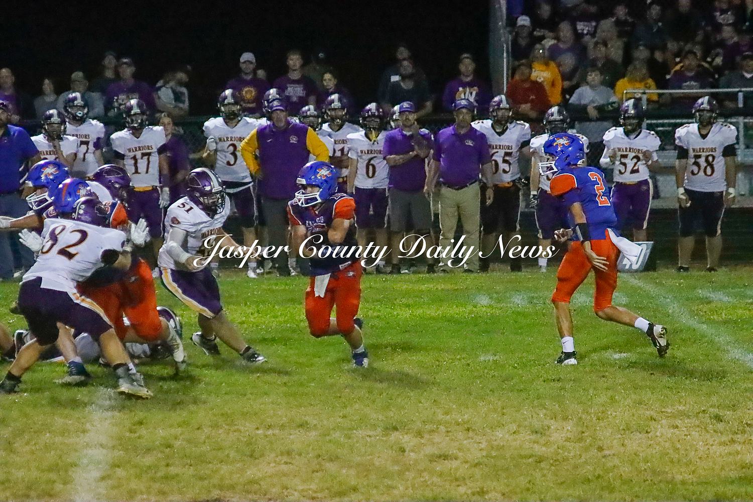 The Warriors scored two touchdowns in the first quarter, two in the second (along with a 30 yard field goal), and one touchdown from a punt return in the fourth quarter.