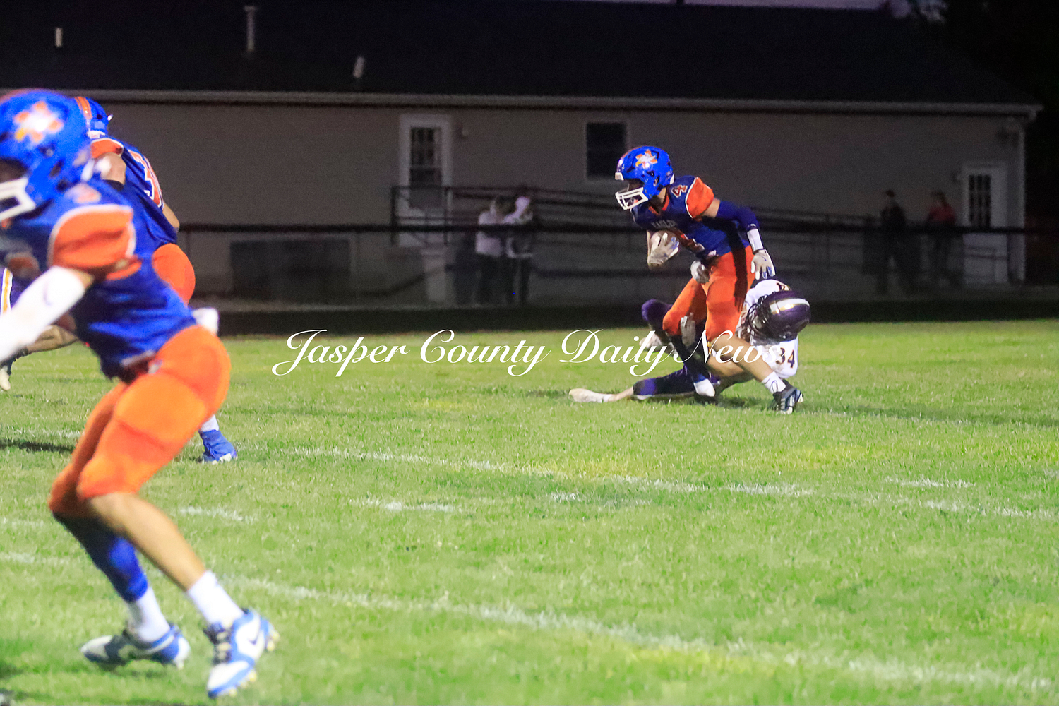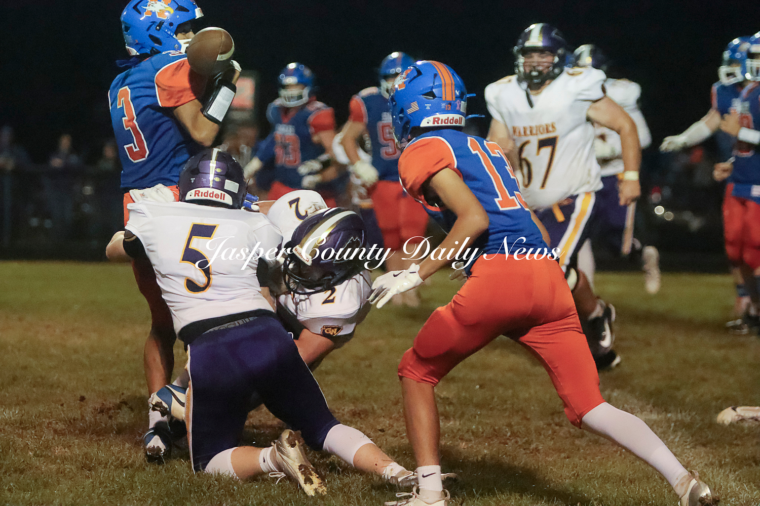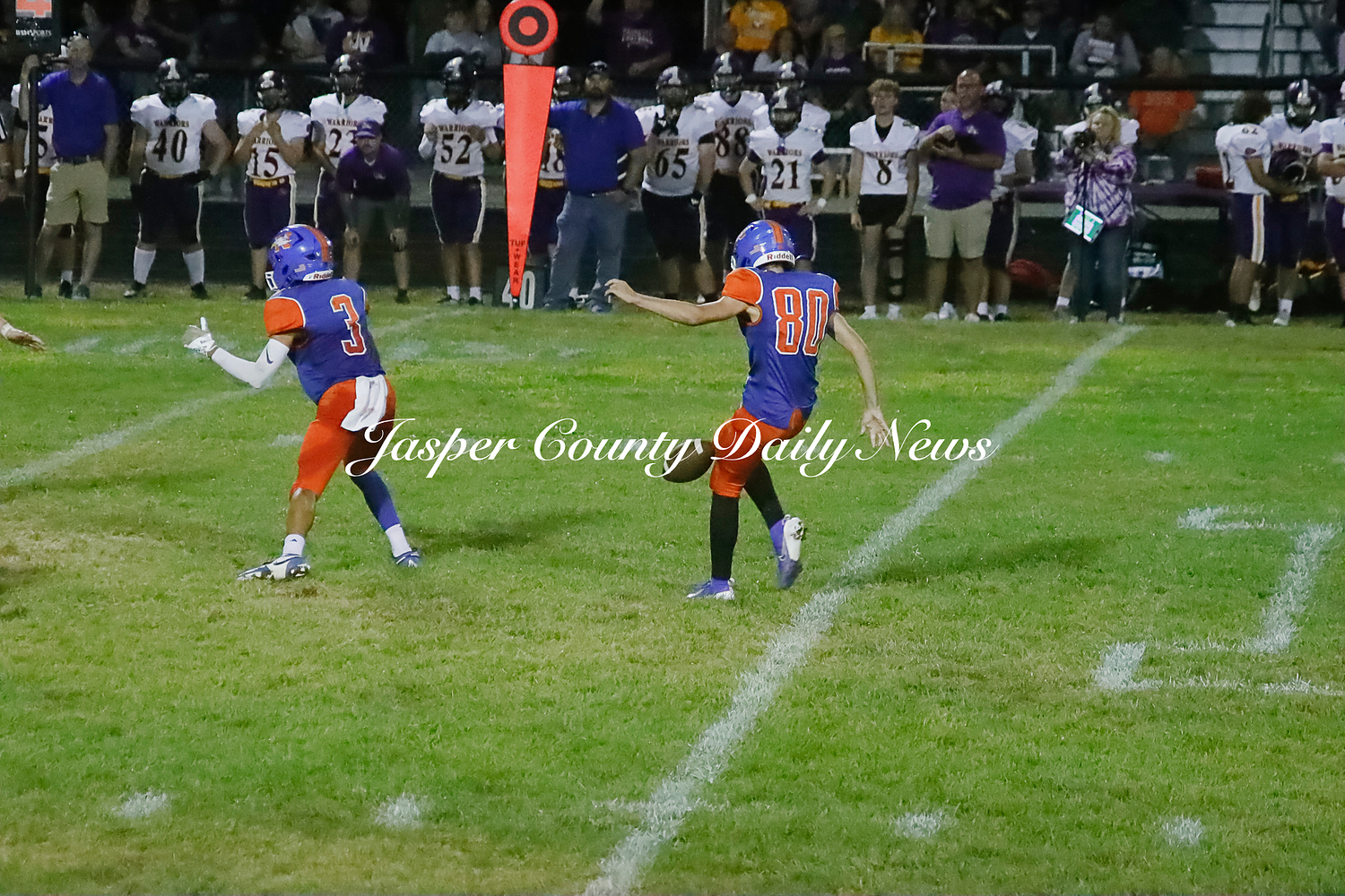 The Warriors scored two touchdowns in the first quarter, two in the second (along with a 30 yard field goal), and one touchdown from a punt return in the fourth quarter.
