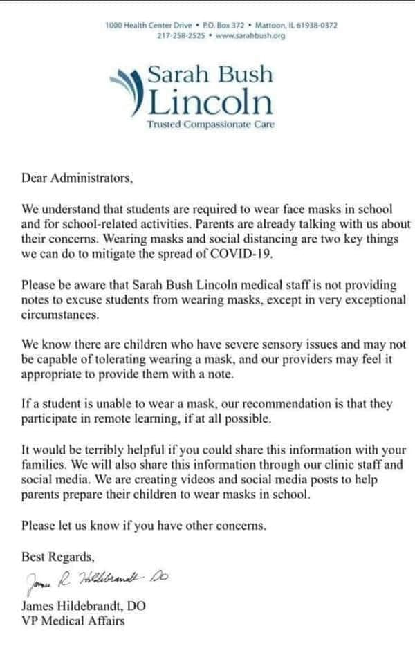 Sarah Bush Lincoln has released their protocol for writing notes to relieve students from wearing masks in schools.