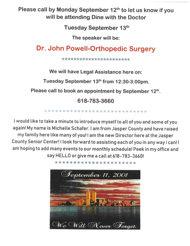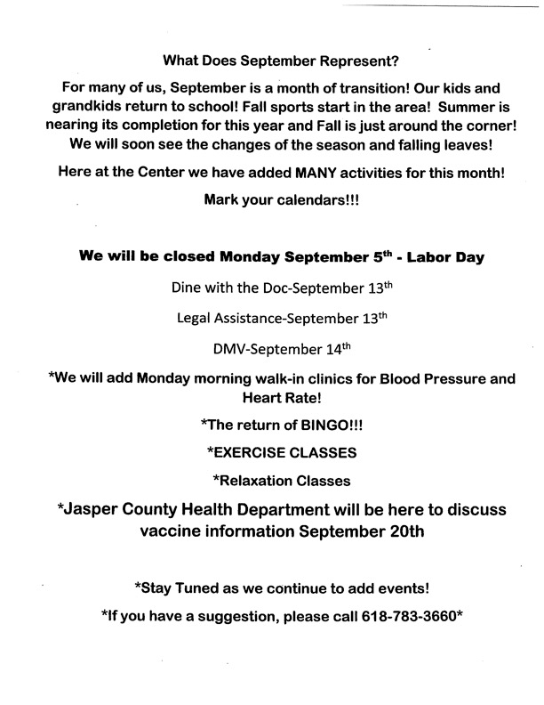 We have a busy week at the center next week Sept. 12th-Sept. 16th! We will have Dine with the Doc on Tuesday from 11:30-1:30pm! Dr. John Powell will be the speaker. If you would like to attend, please call us at 618-783-3660 by Monday September 12th to register! The DMV will be onsite Wednesday from 10am-2pm. We have blood health screenings and exercise class scheduled next week also!!!