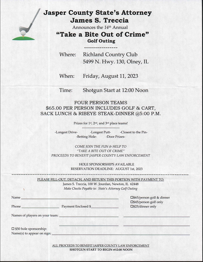 The 14th Annual “Take A Bite Out of Crime” golf outing hosted by Jasper County State’s Attorney James S. Treccia will be held on Friday, August 11, 2023, at the Richland Country Club in Olney, IL. There will be a shotgun start at noon. The teams will consist of four people with a cost of $65 per person which includes golf and cart. A sack lunch and a ribeye steak dinner at 5 pm will be included. There are prizes for the 1st, 2nd, and 3rd place teams. Hole sponsorships are available. For more information see below.