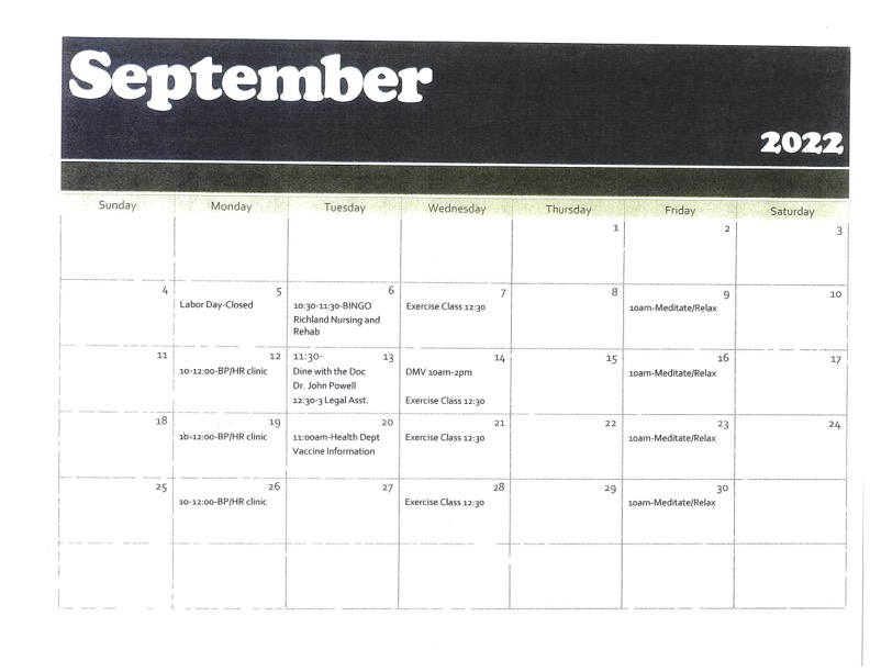 We have several activities planned for the month of September including exercise classes, Dine with the Doc, the Jasper County Health Department will talk about vaccine recommendations, blood pressure monitoring and several other activities. Call us at 618-783-3660 with inquiries!