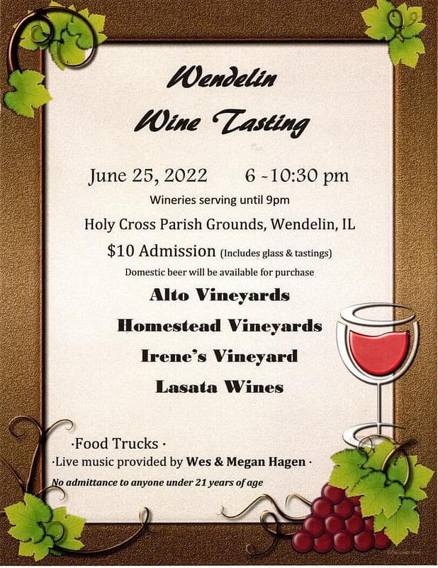 Wendelin will be hosting their annual Wine Tasting on June 25th from 6-10:30pm with the wineries serving until 9 pm. This will be held at Holy Cross Parish Grounds in Wendelin. There is a $10 admission and domestic beer will also be available for purchase. Must be 21 to enter.